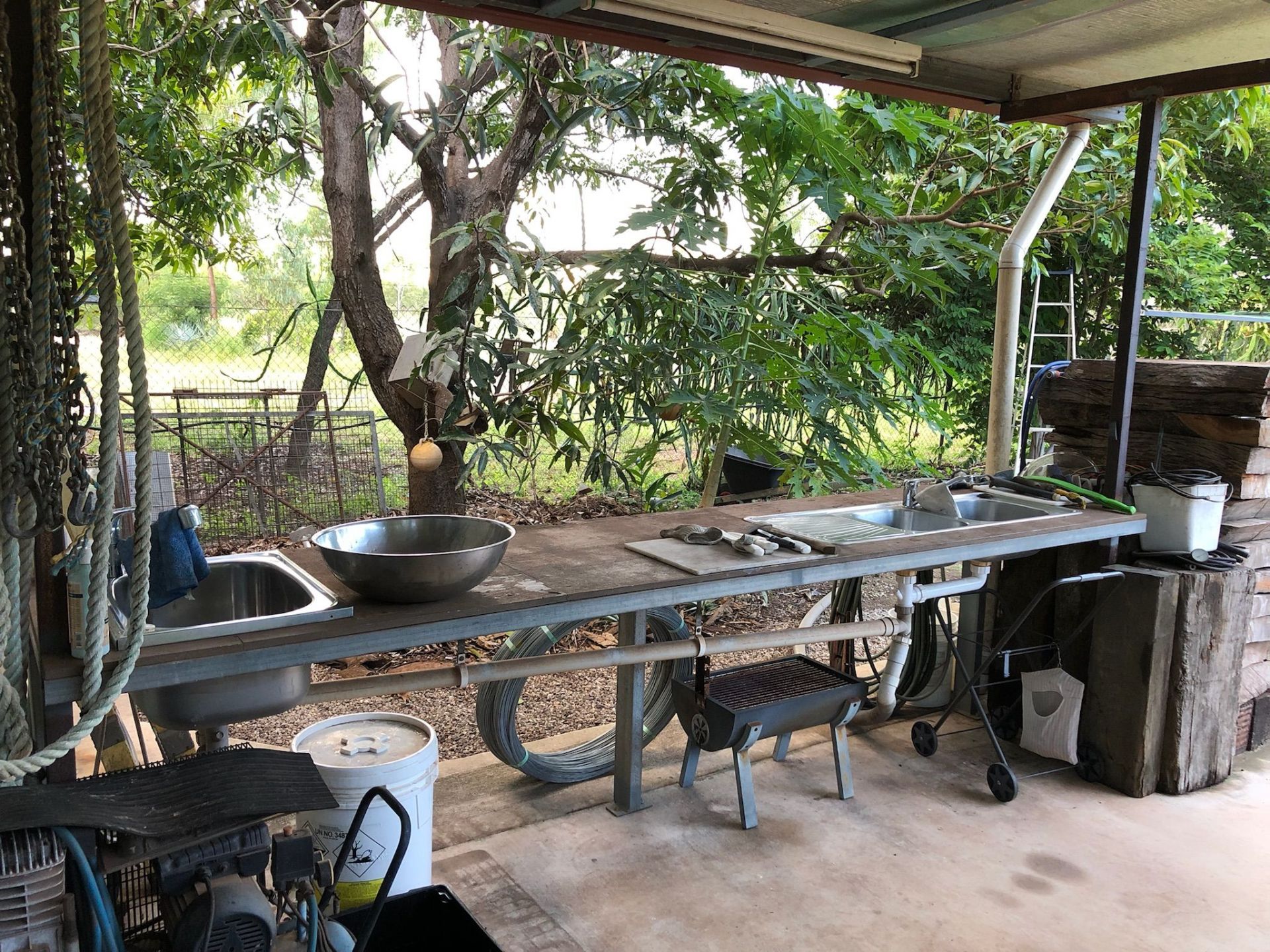 Outdoor work area, with cleaning bench including sink and tub perfect for cleaning fish and mud crabs.
