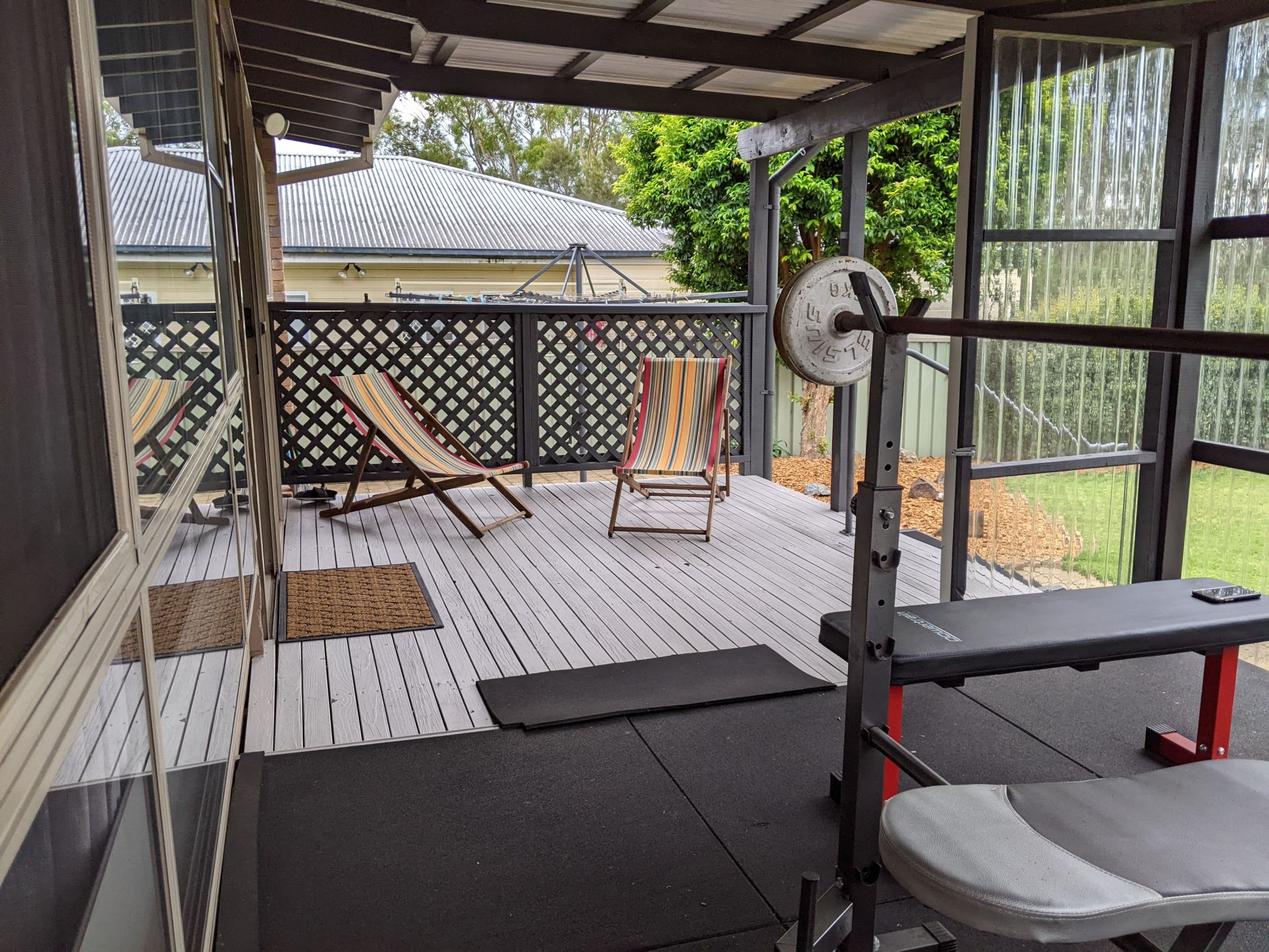 - Rear undercover verandah (6.8 x 2.9m), partially enclosed and currently used as a gym