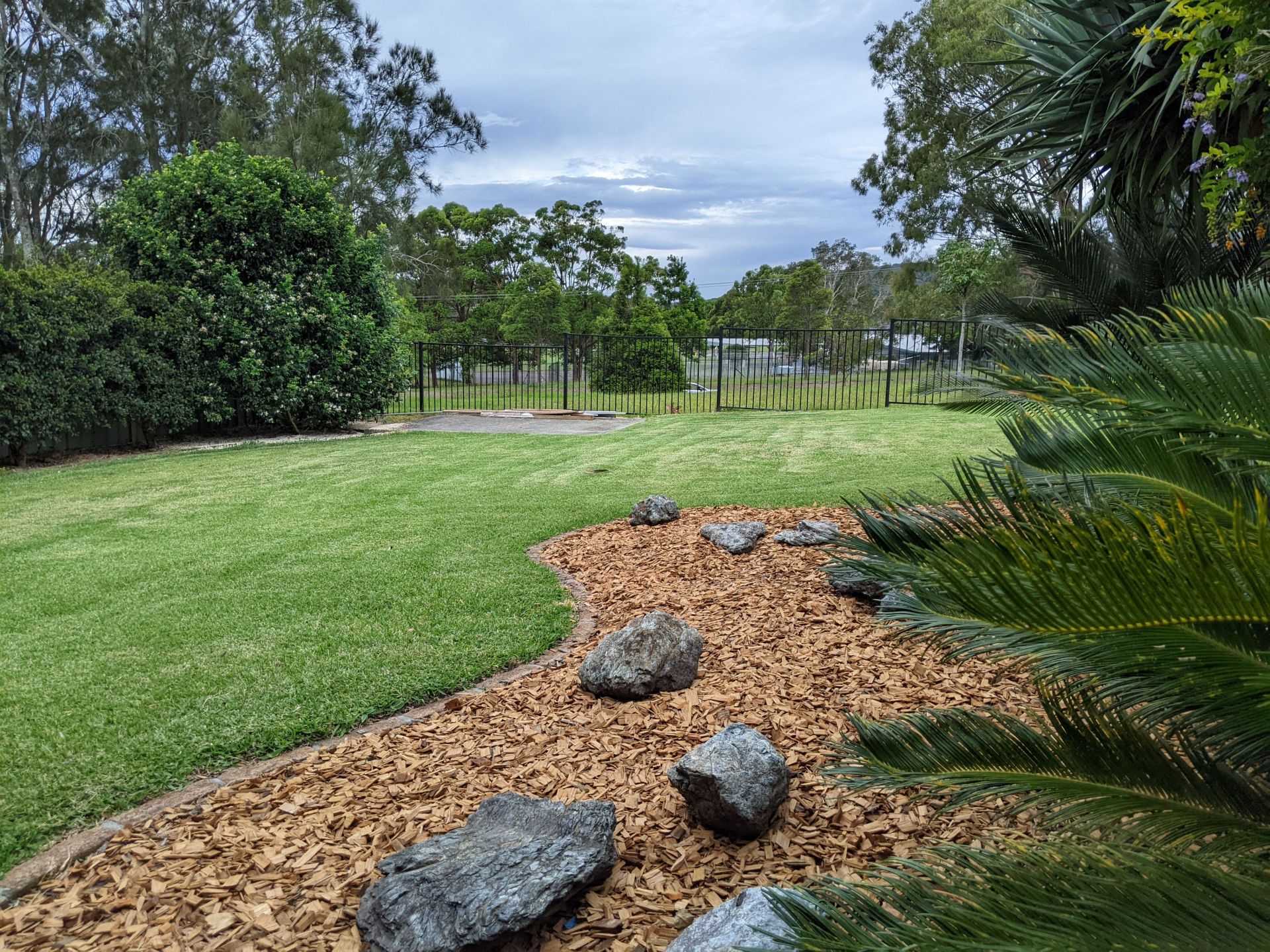 - Landscaped gardens and large lawn area in backyard; fully fenced
