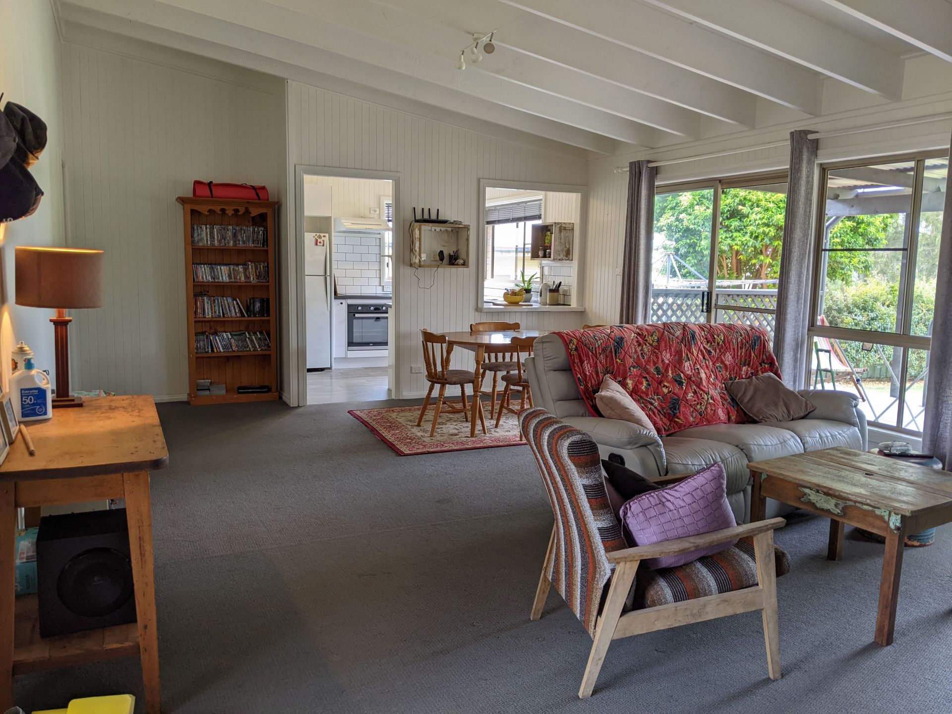4 bedroom house in beautiful Forster Keys area with a low and leafy frontage, opens into a surprisingly spacious living area with high raked ceilings.