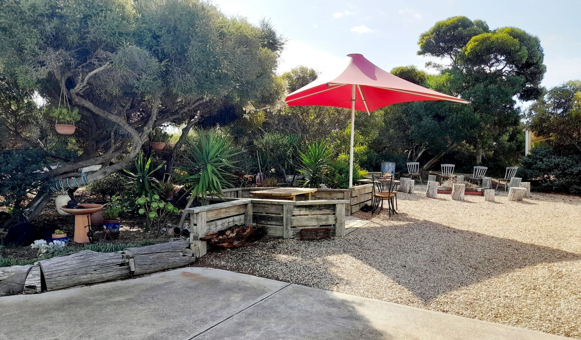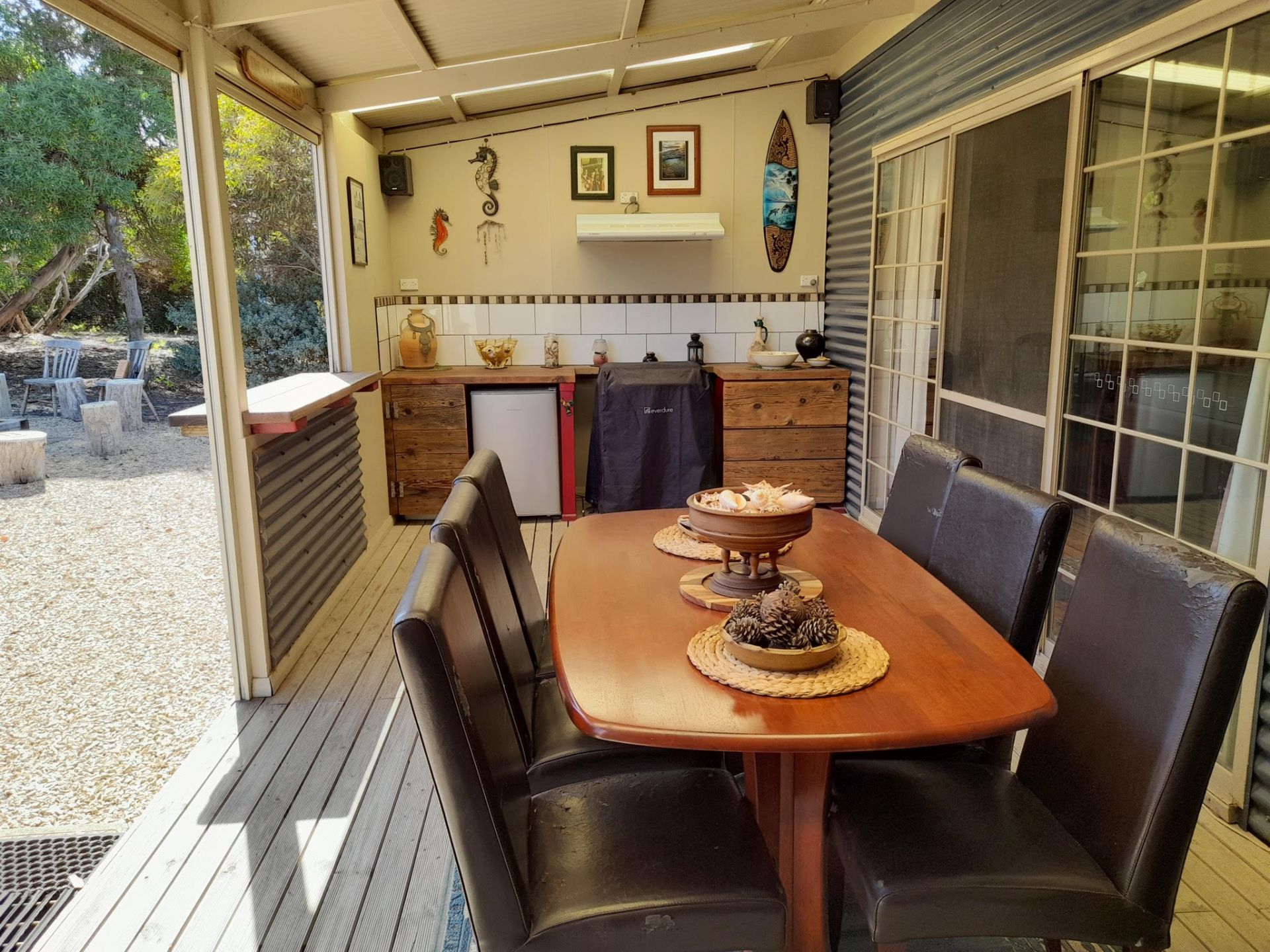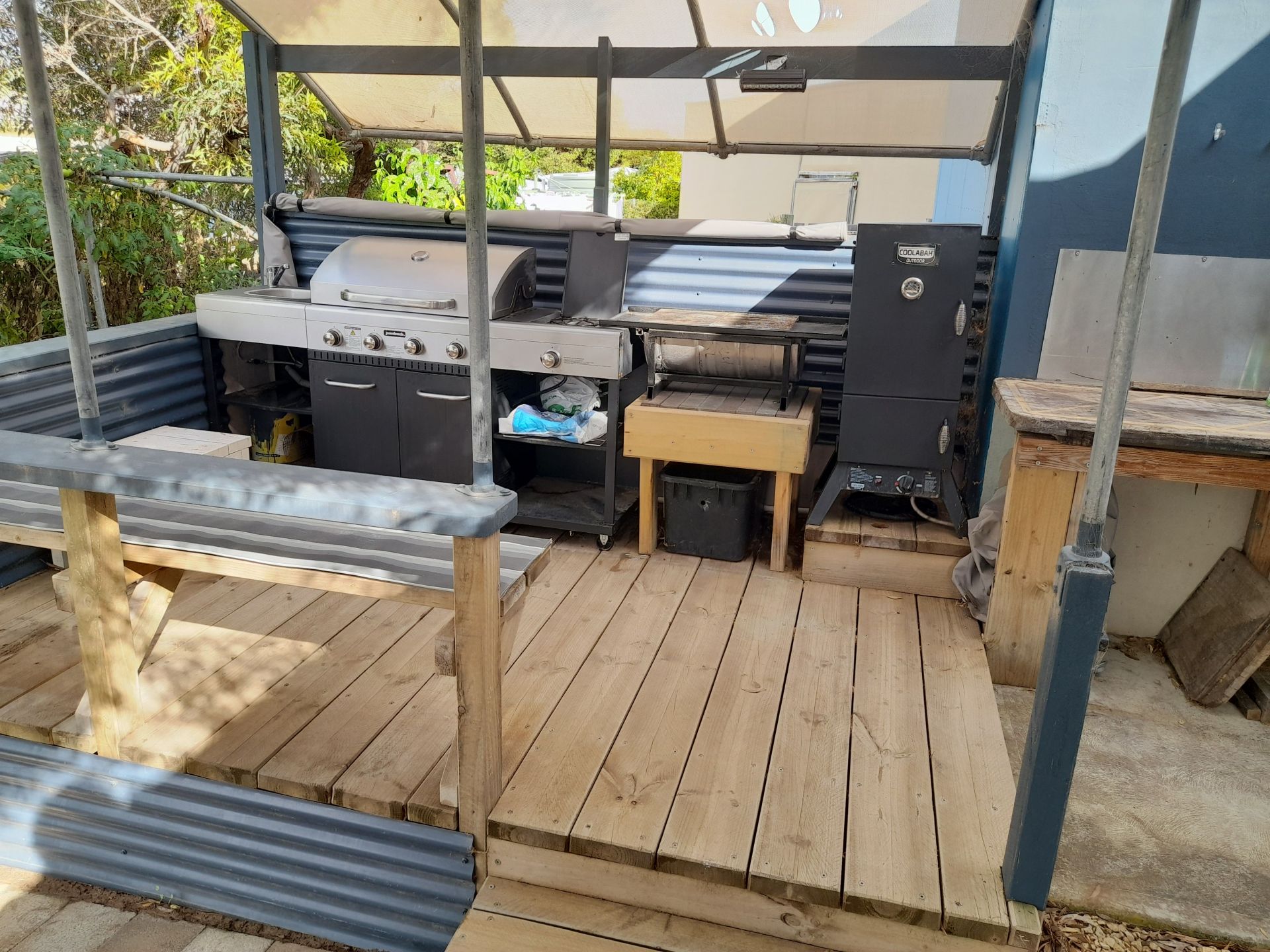 The outside areas offer multiple entertaining possibilities. Starting with an undercover kitchen/dining/lounge area at the front of the house, then moving outside to a gazebo shaded by a permanent umbrella, set in a beautiful garden(the ideal spot for sundowners with friends). Still part of this garden, is a fire pit with informal seating. At the back of the house, accessed by a wheelchair ramp, is a small deck for those quiet, contemplative breakfasts. Further along, out from the atrium is another outdoor entertaining area featuring a gas BBQ, with hot water, wok burner, charcoal habachi grill and smoker. This deck area spans an underground 10000L rainwater tank.