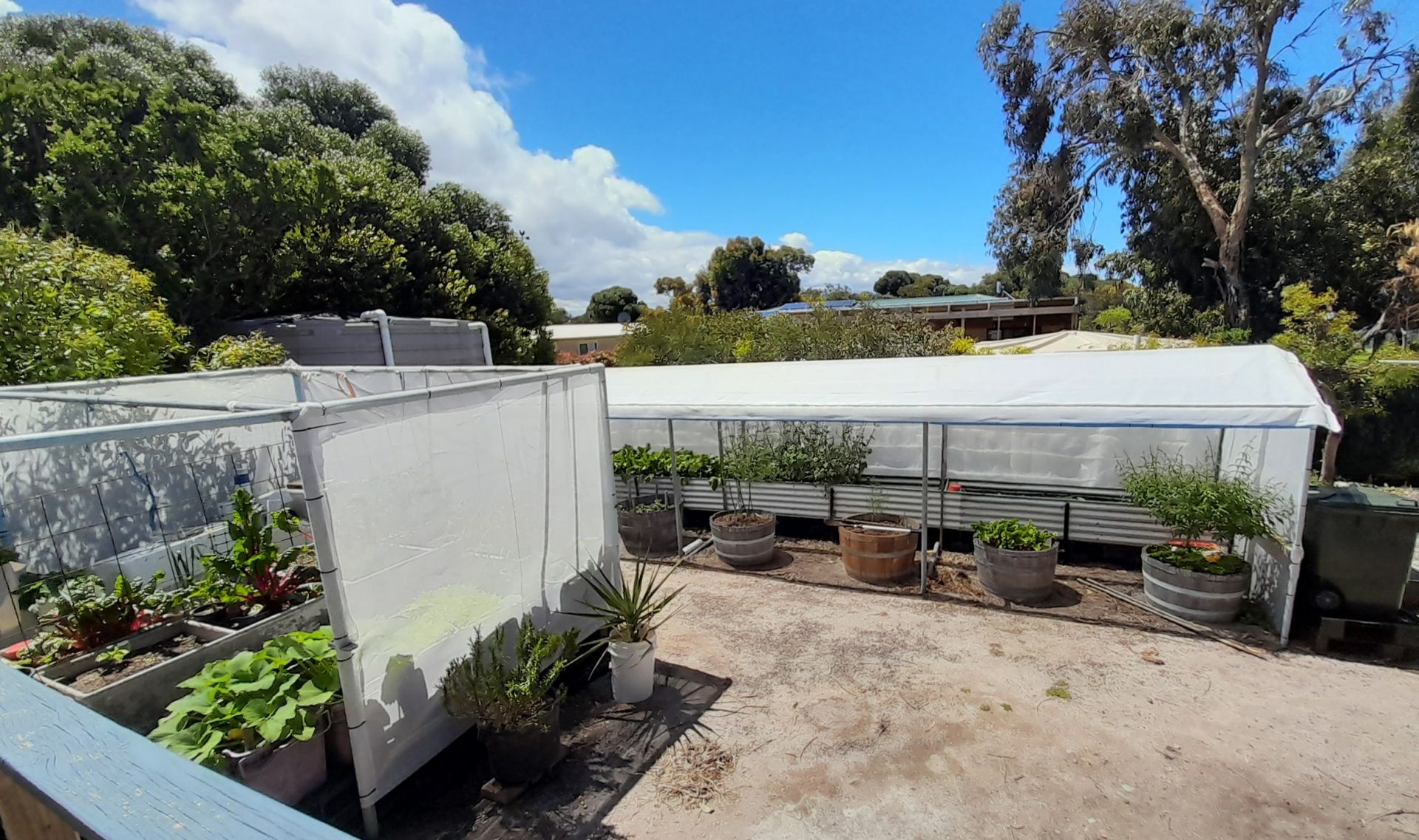 The rear garden has two shade house areas, espalliered fruit trees and a 3m x 3m garden shed.