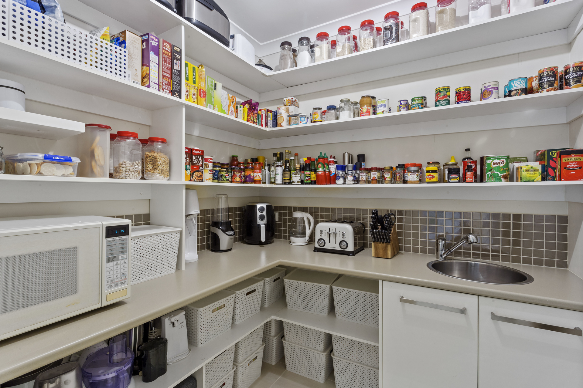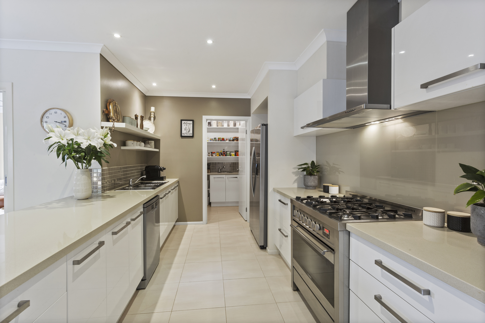 The kitchen features stone benchtops, a 900mm stainless steel Blanco upright stove and rangehood, double sink, dishwasher and a large butler's pantry.