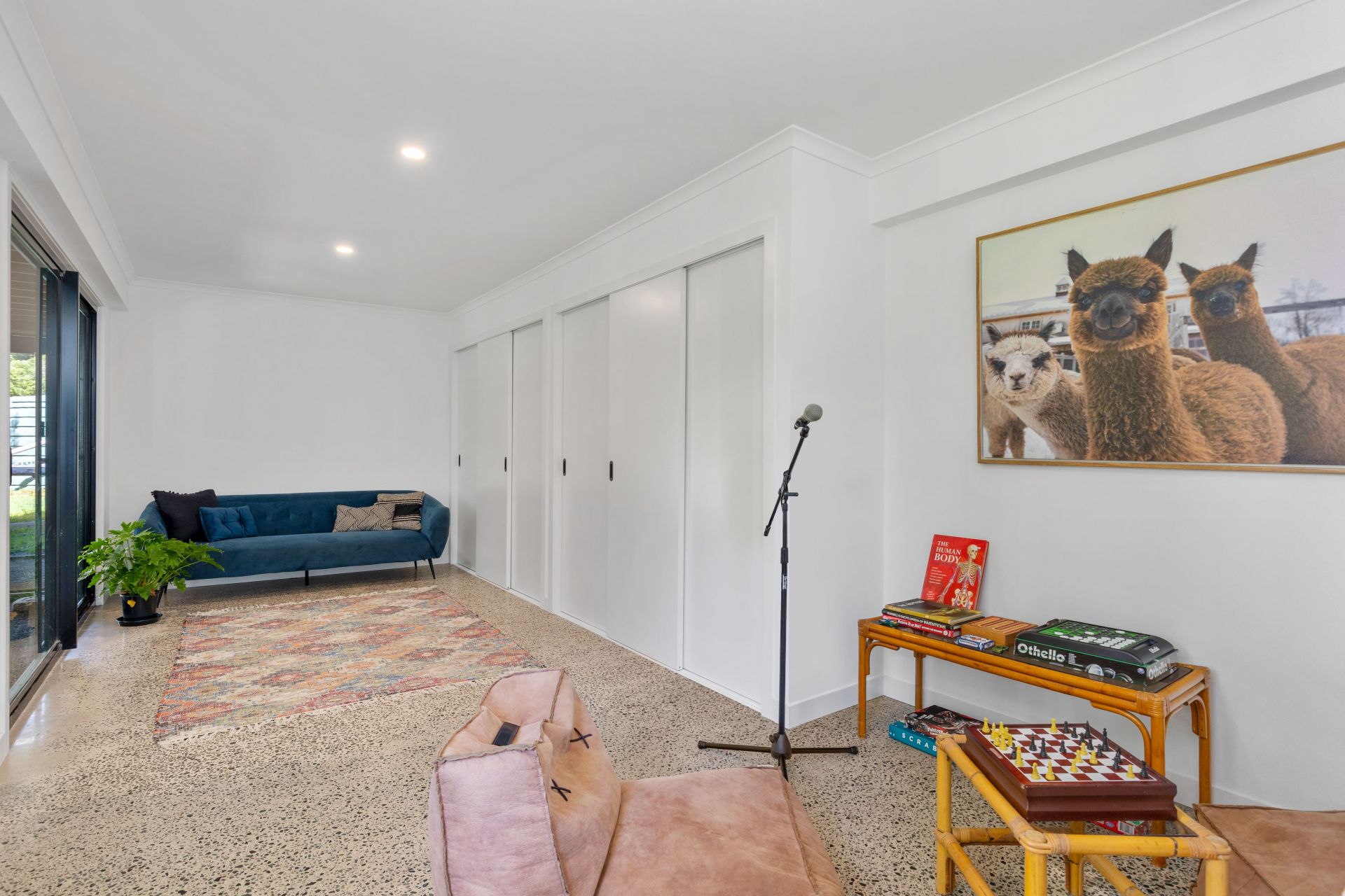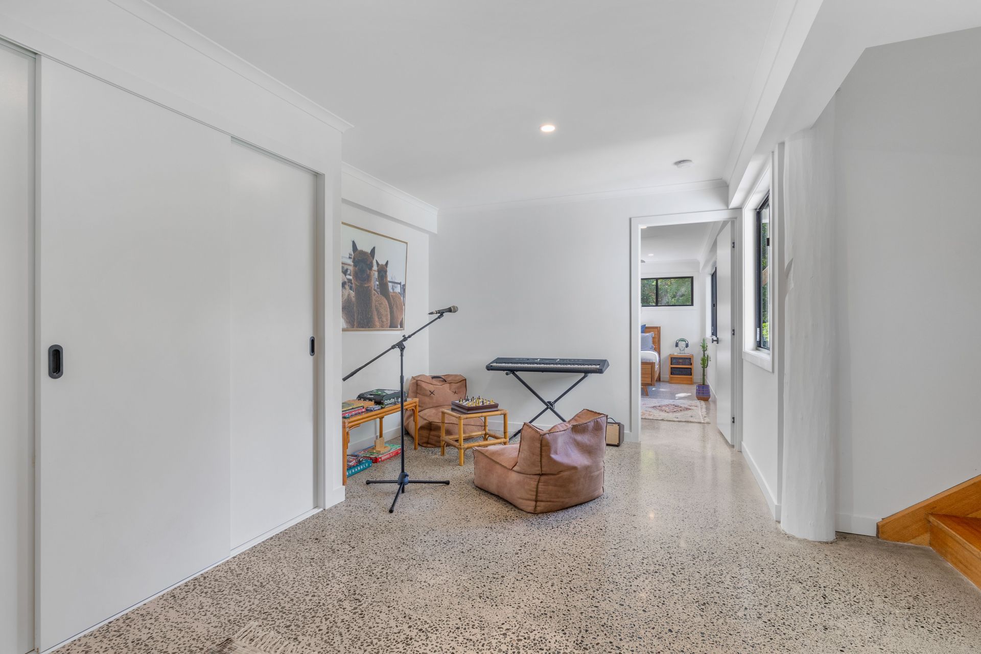 Downstairs is a newly renovated living space with modern polished concrete floors.
