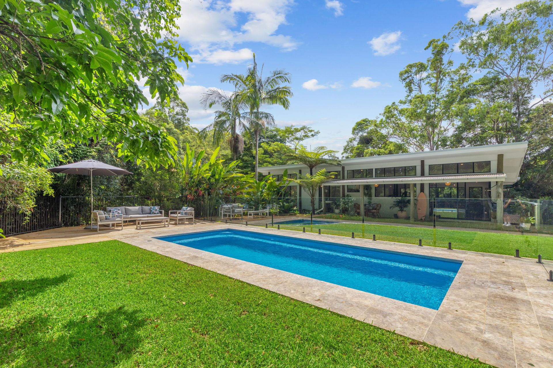 The kitchen has 3.6M high ceilings and also offers views of the courtyard that features a brand new 8 metre Ecoswim magnesium family in-ground pool. The decking area of the pool backs on to the rainforest and is built from iron bark.