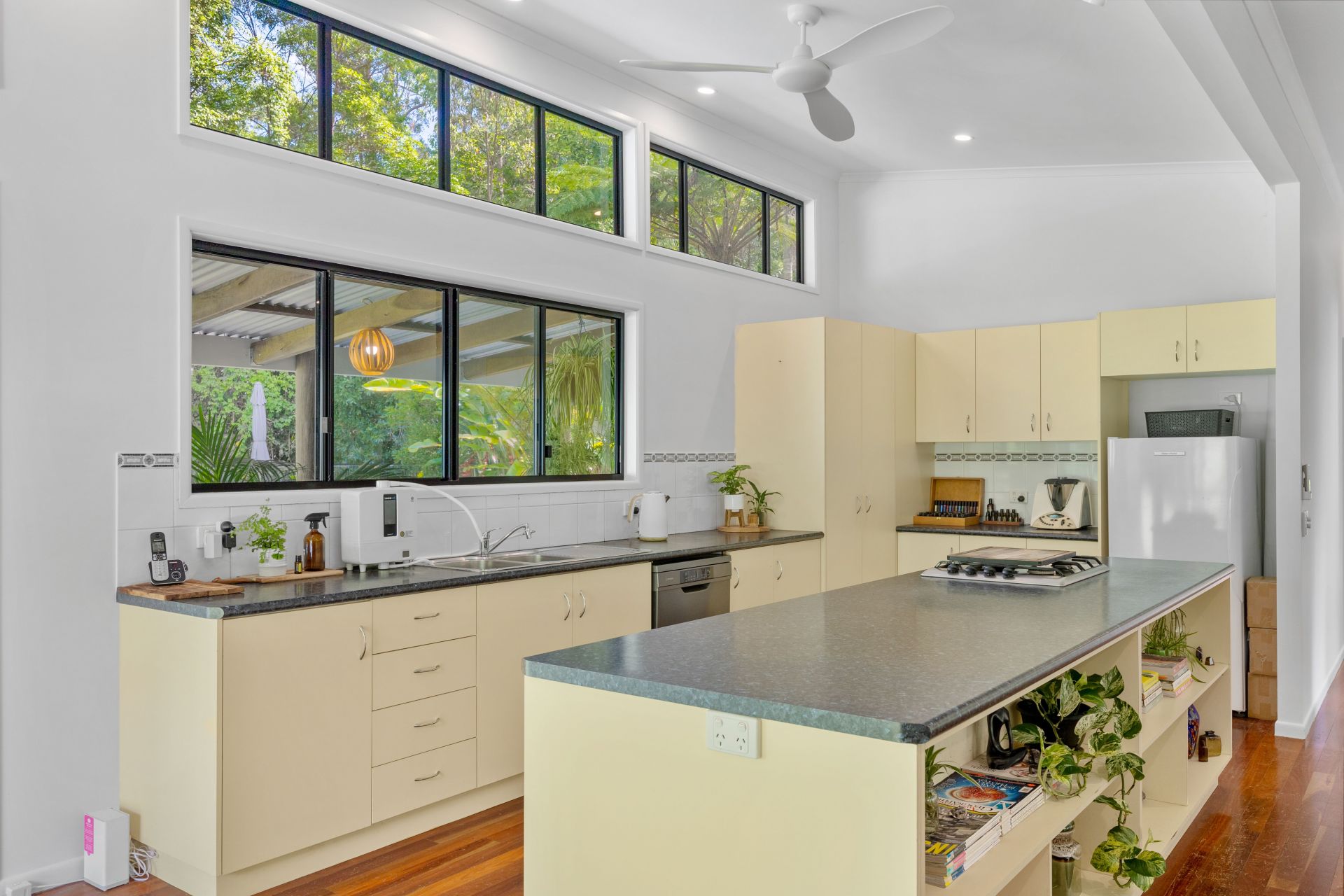 A Large Galley style kitchen that opens up to the whole dining and living space with large high black framed windows overlooking the lush hills, rainforest and bushland and pool area.