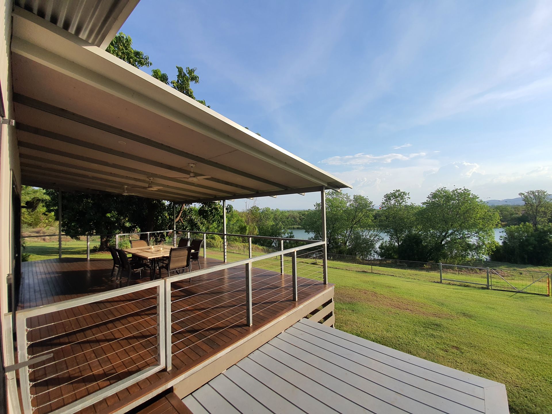 • New, steel framed 4 bedroom house (about 3 years old) with ensuite and family bathroom. Two living areas, kitchen, walk-in storeroom, walk-in pantry, a large timber deck provides outdoor living space with sweeping views of the river. External laundry with a screen enclosed rear verandah. Expansive views of sunset over the river can been seen from the kitchen/living area through two large corner windows. Both windows are double glazed, separate plumbing + electrical system to this dwelling.