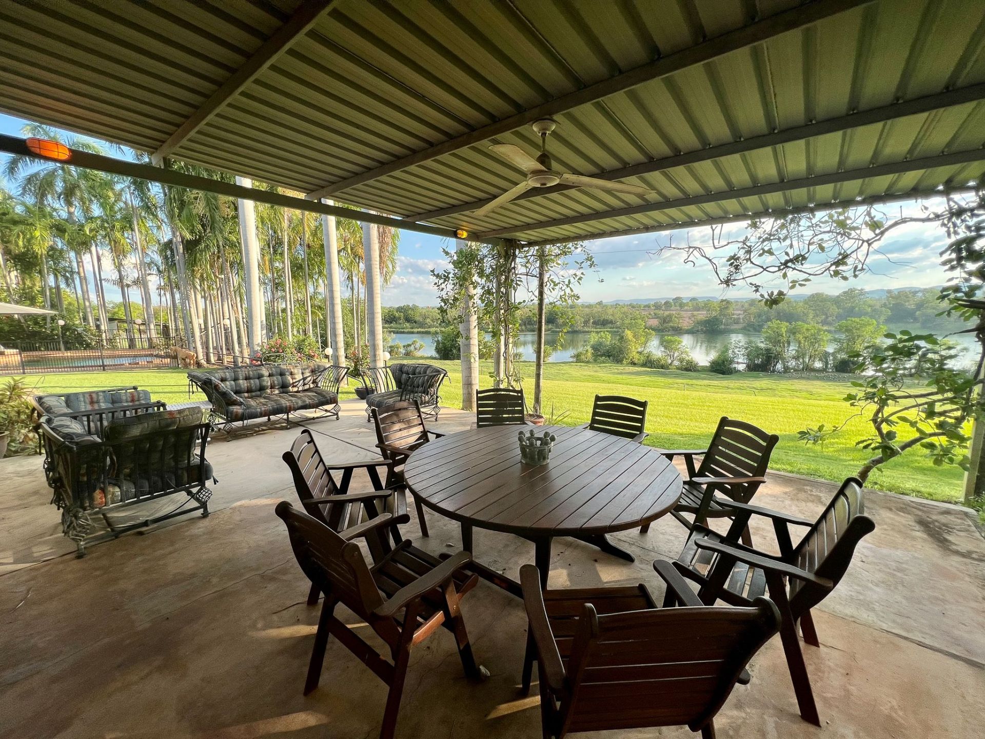 • Sweeping views of the lower Ord River across to the Ranges from the well presented and maintained, 3 bedroom, country style, concrete house with 3m wrap around verandahs & entertaining deck. Comprises ensuite, family bathroom, kitchen, study, walk-in pantry/storeroom, dining lounge room, family room and laundry. [ simple to convert the study into a single 4th bedroom if required]. 5 kw solar system has been installed.