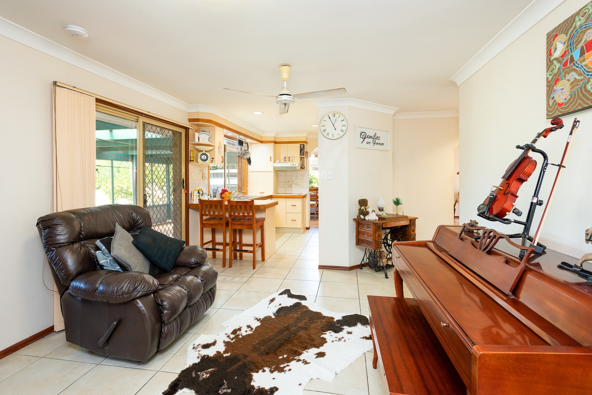 As you enter the home you'll find the comfortable air-conditioned living area that flows through to the family room and kitchen, and out to the large enclosed outdoor patio.