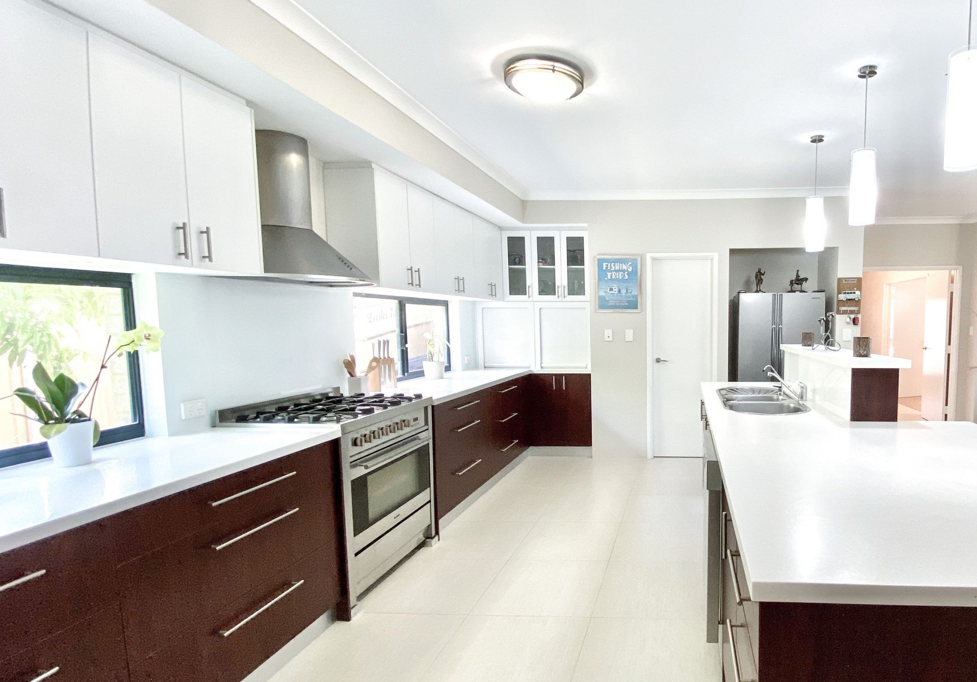 * Large, well appointed kitchen with an abundance of overhead and under bench storage. Double sinks with glass splashbacks. Under-sink water filtration system. Large dishwasher. 900mm stainless steel gas cooktop with electric fan forced oven and stainless steel rangehood with glass splashback.