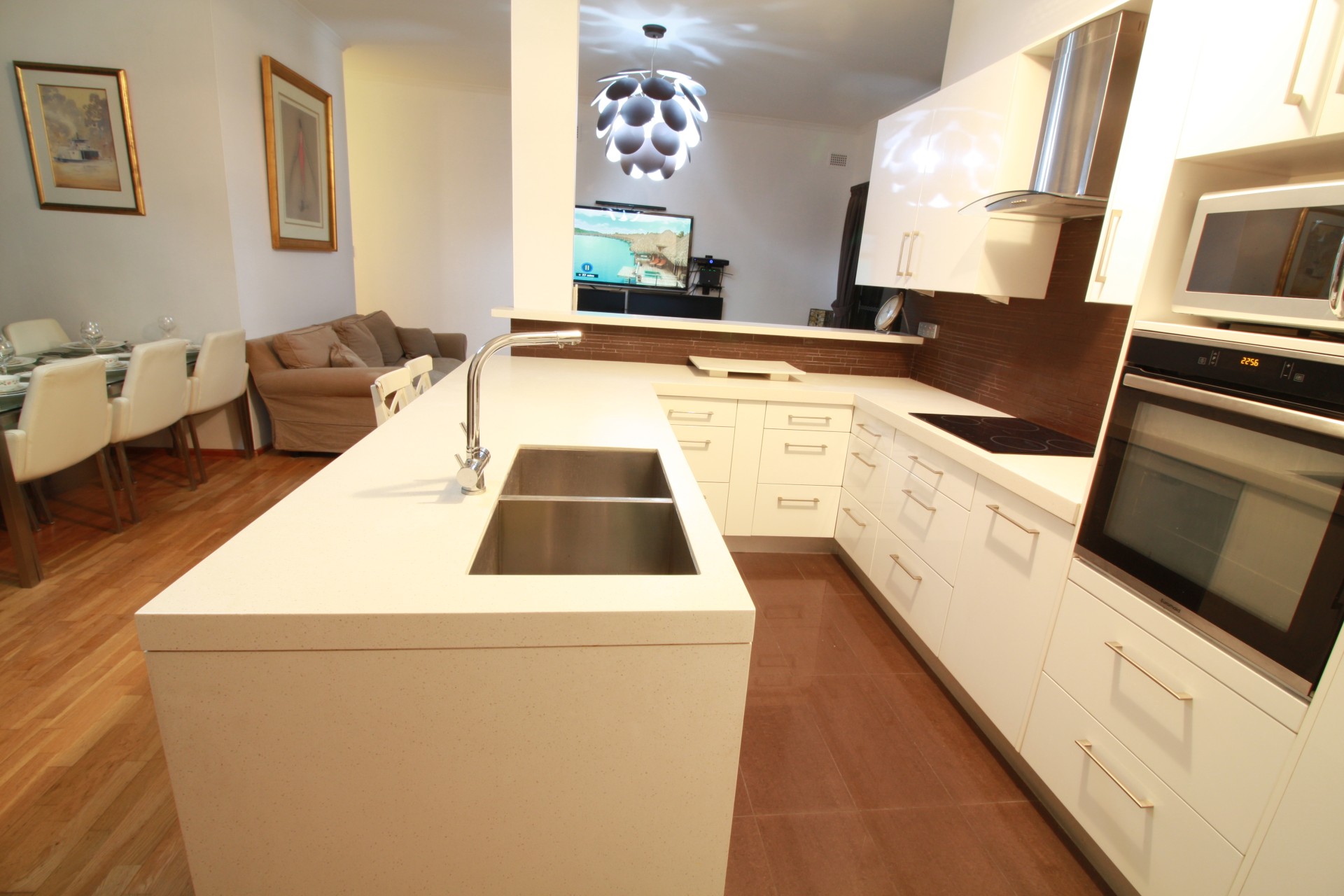 Chefs Gourmet Eat In Kitchen with 4 seat Breakfast Bar, 60mm Stone bench top, Dishwasher, Water and Ice dispensing fridge, Quality appliances, Pantry and Oven Towers.