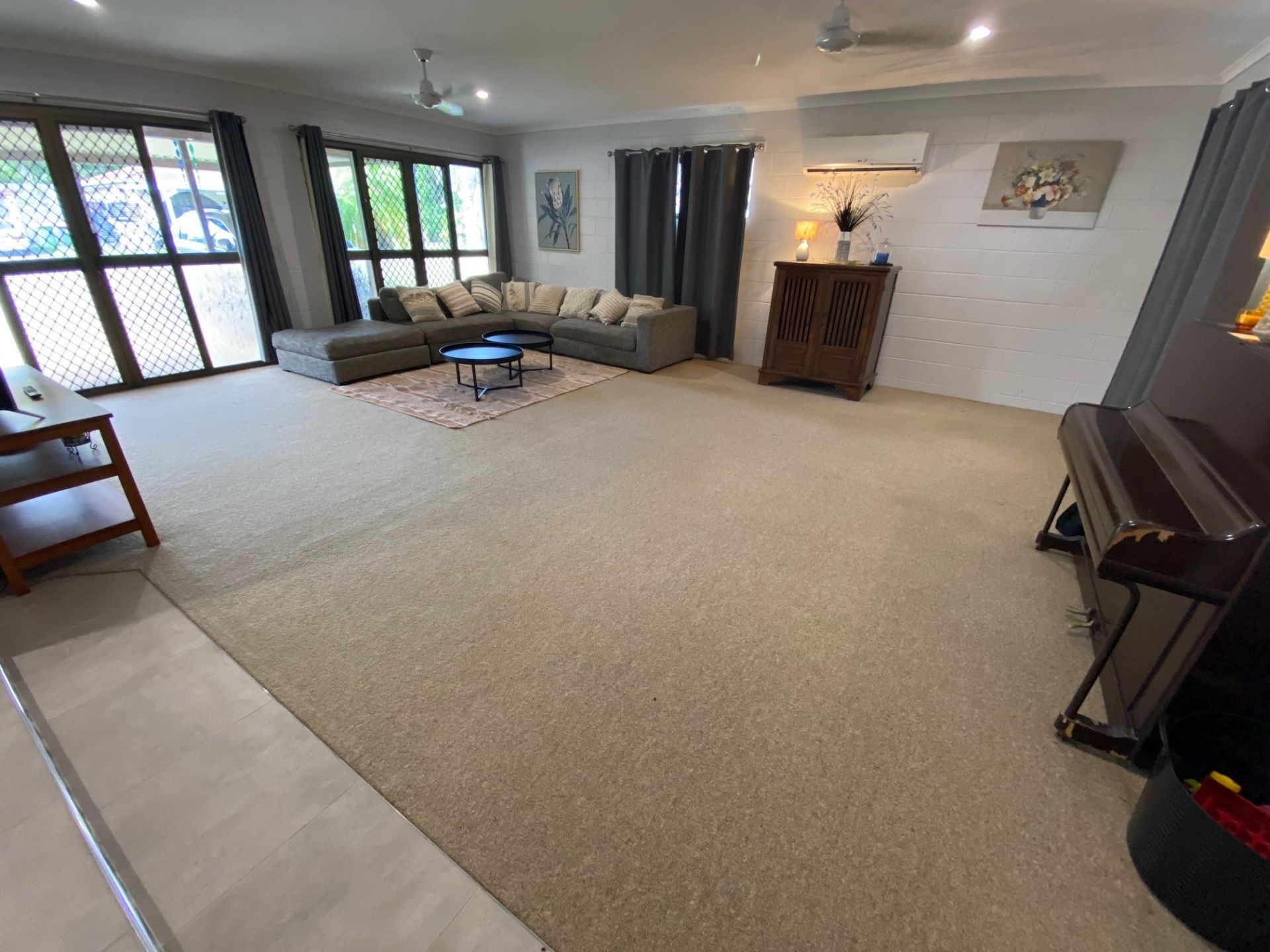 The living areas are tiled with the lounge room being newly carpeted.