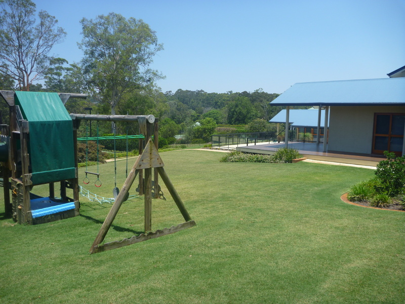 The uniquely designed large swimming deck features a 14-metre timber seating bench with plenty of hidden storage for all the pool toys. Glass fencing surrounds the 12.5metre pool. A timber play fort with swings is conveniently located to be easily seen.