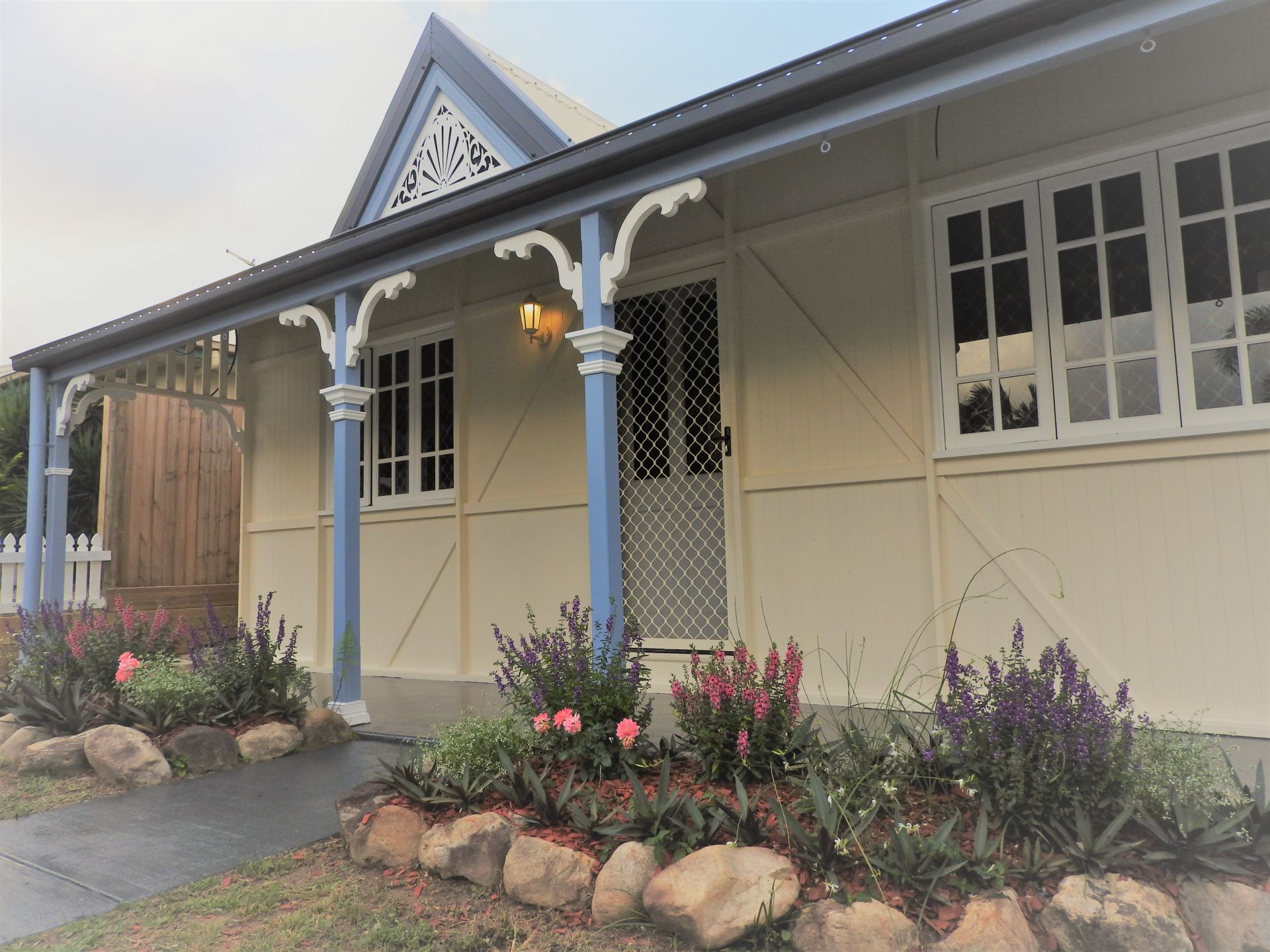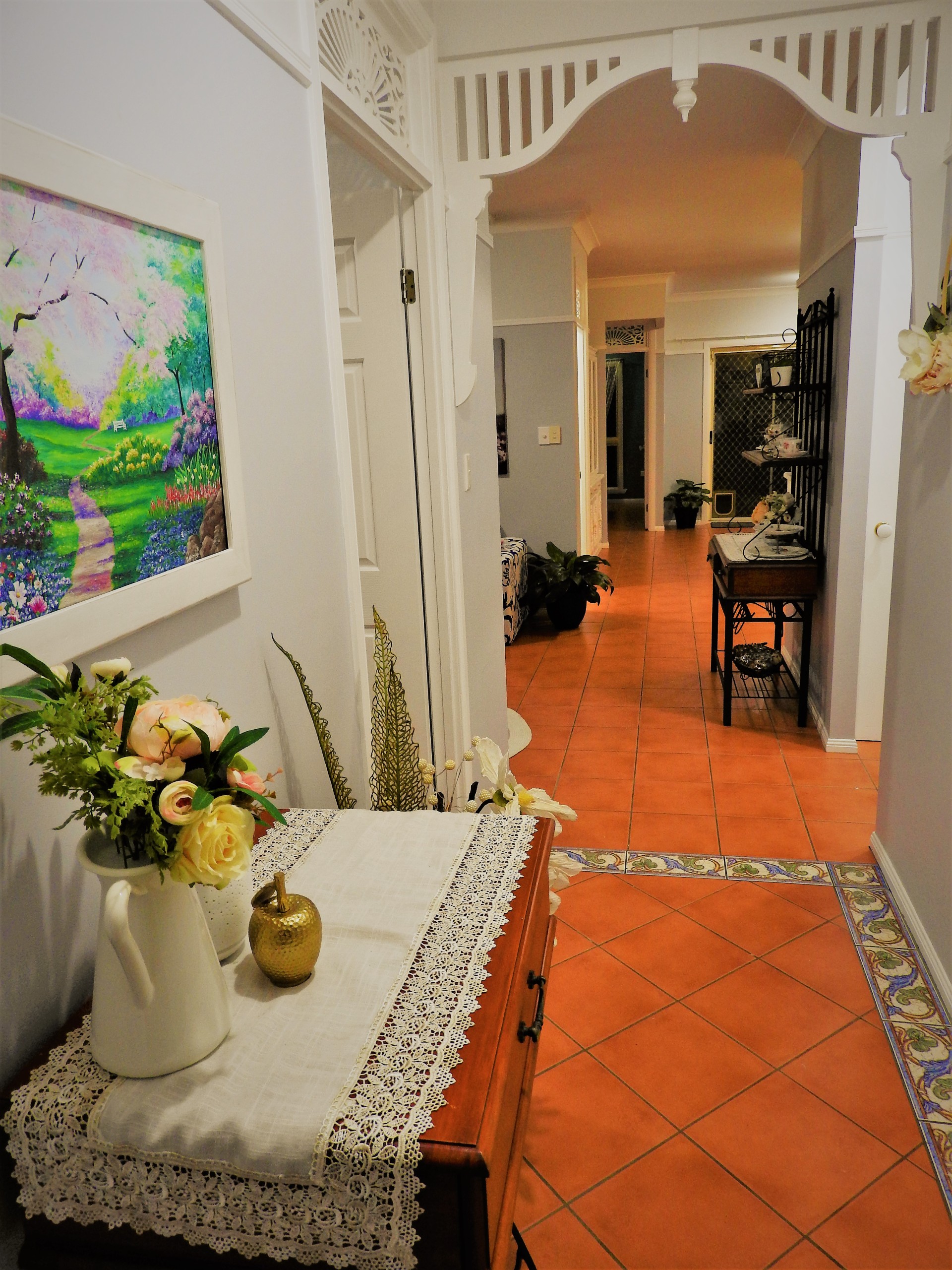 This gorgeous home has some unique characteristics with a Queensland colonial feel. It features decorative breezeways above the doors, the colonial arch in the entrance, and colonial trim on the walls with a unique front elevation.