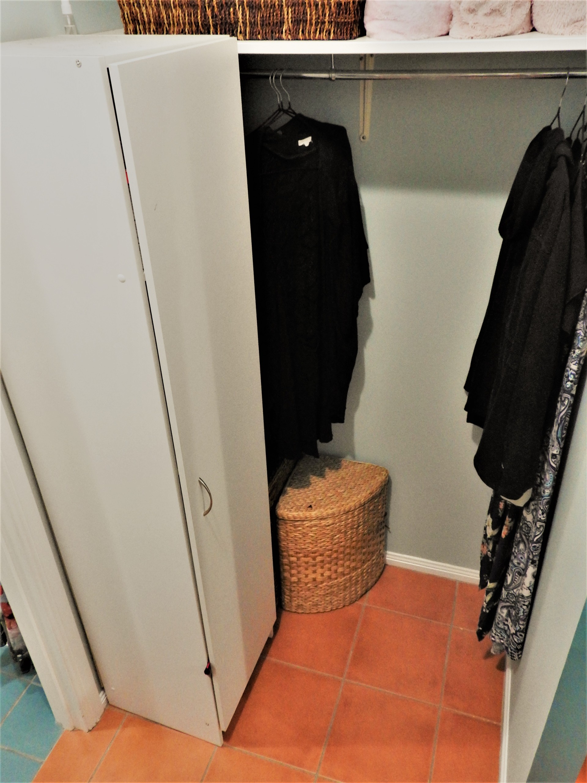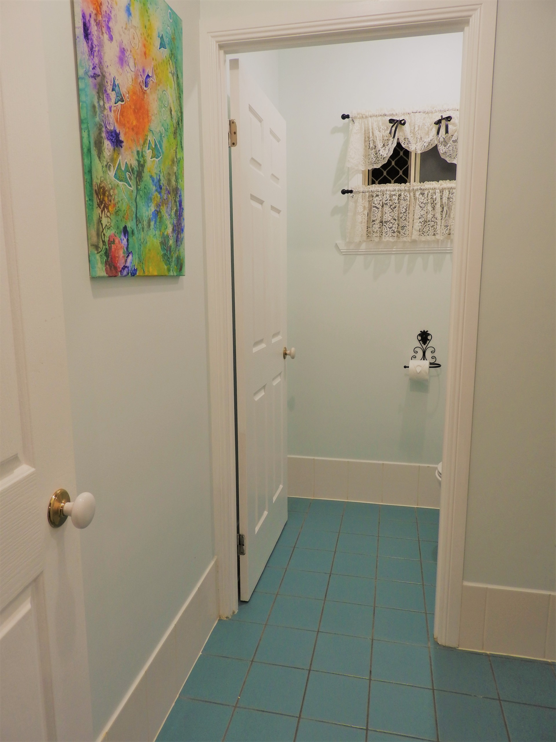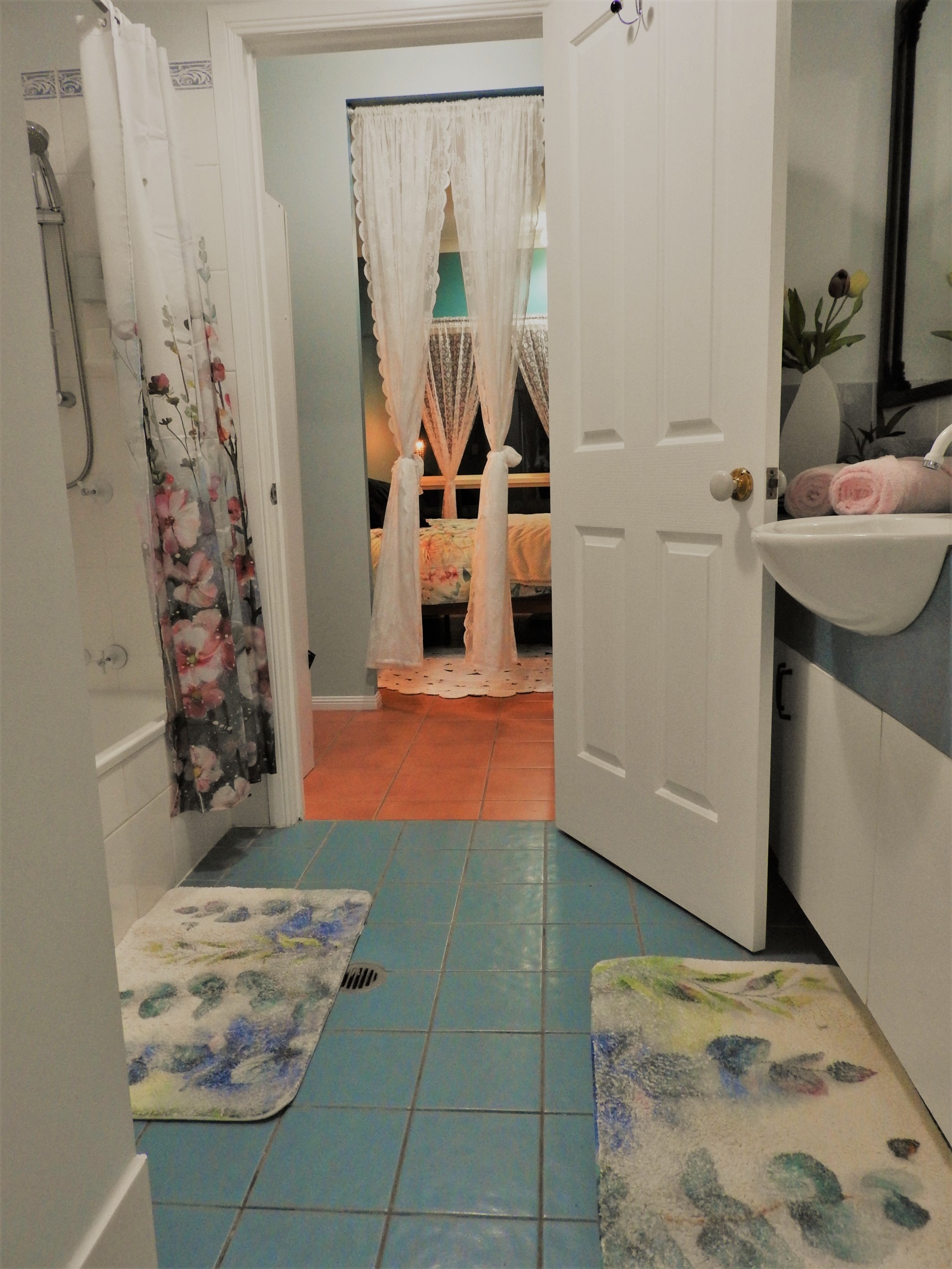 The bathroom and toilet are in separate rooms. The bathroom has a tub and connecting shower to indulge in a relaxing bubble bath after a stressful day.