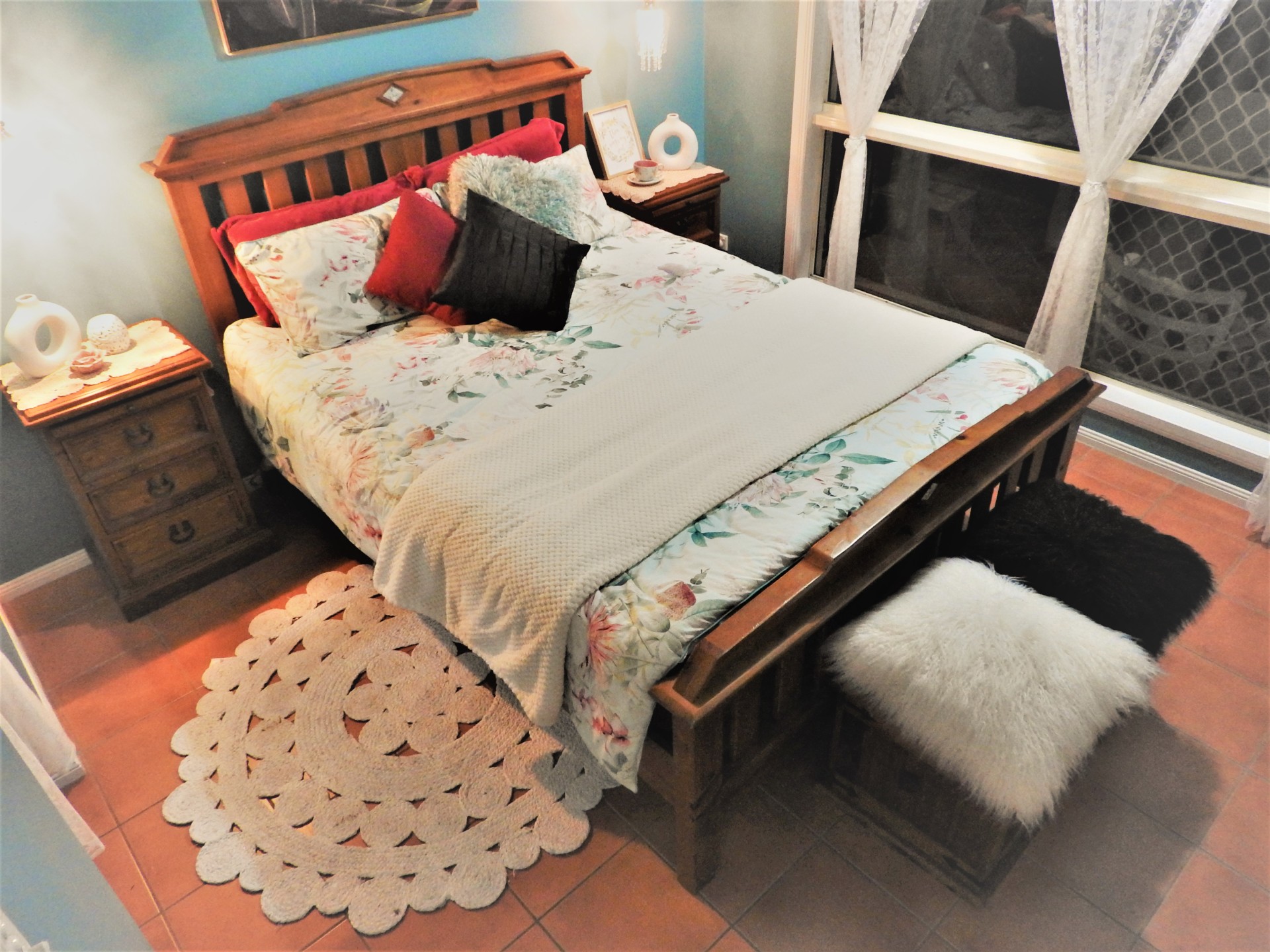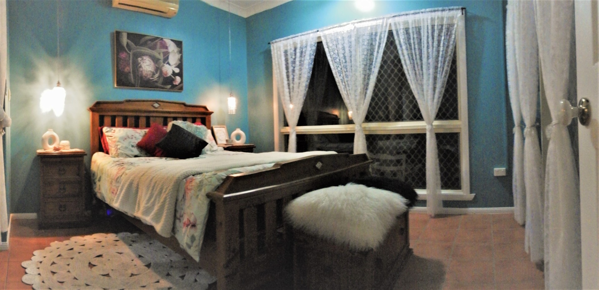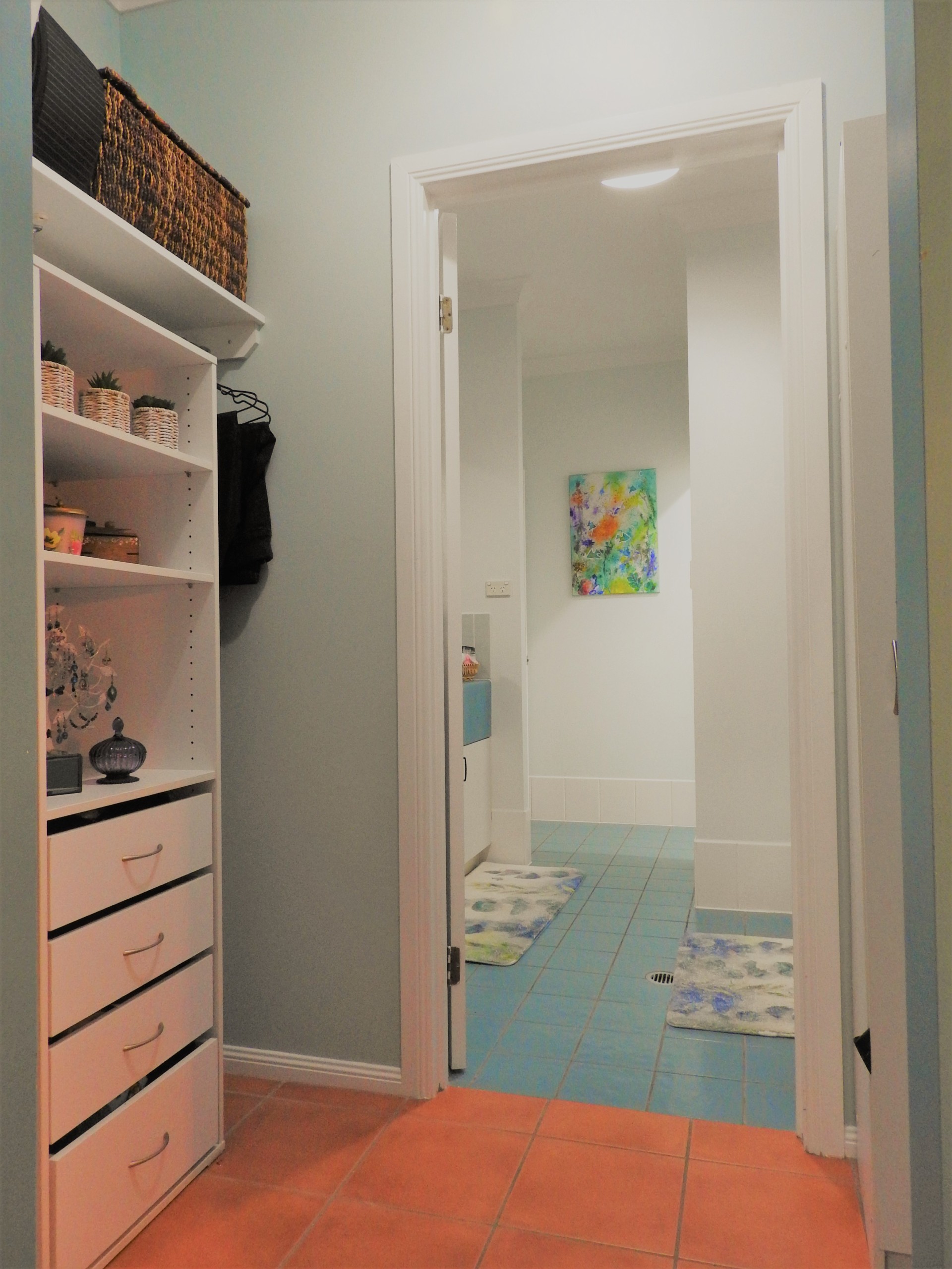 The spacious master bedroom has a walk-in robe connecting to the bathroom.