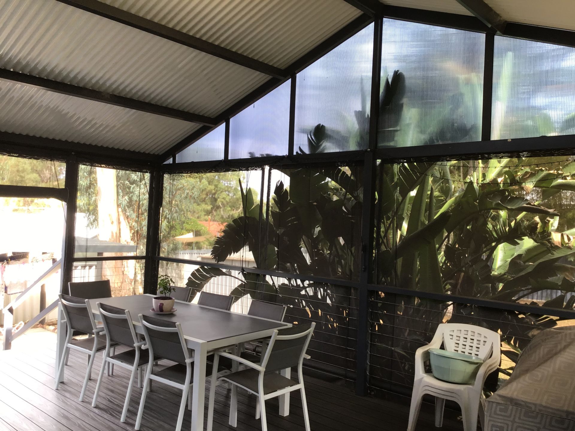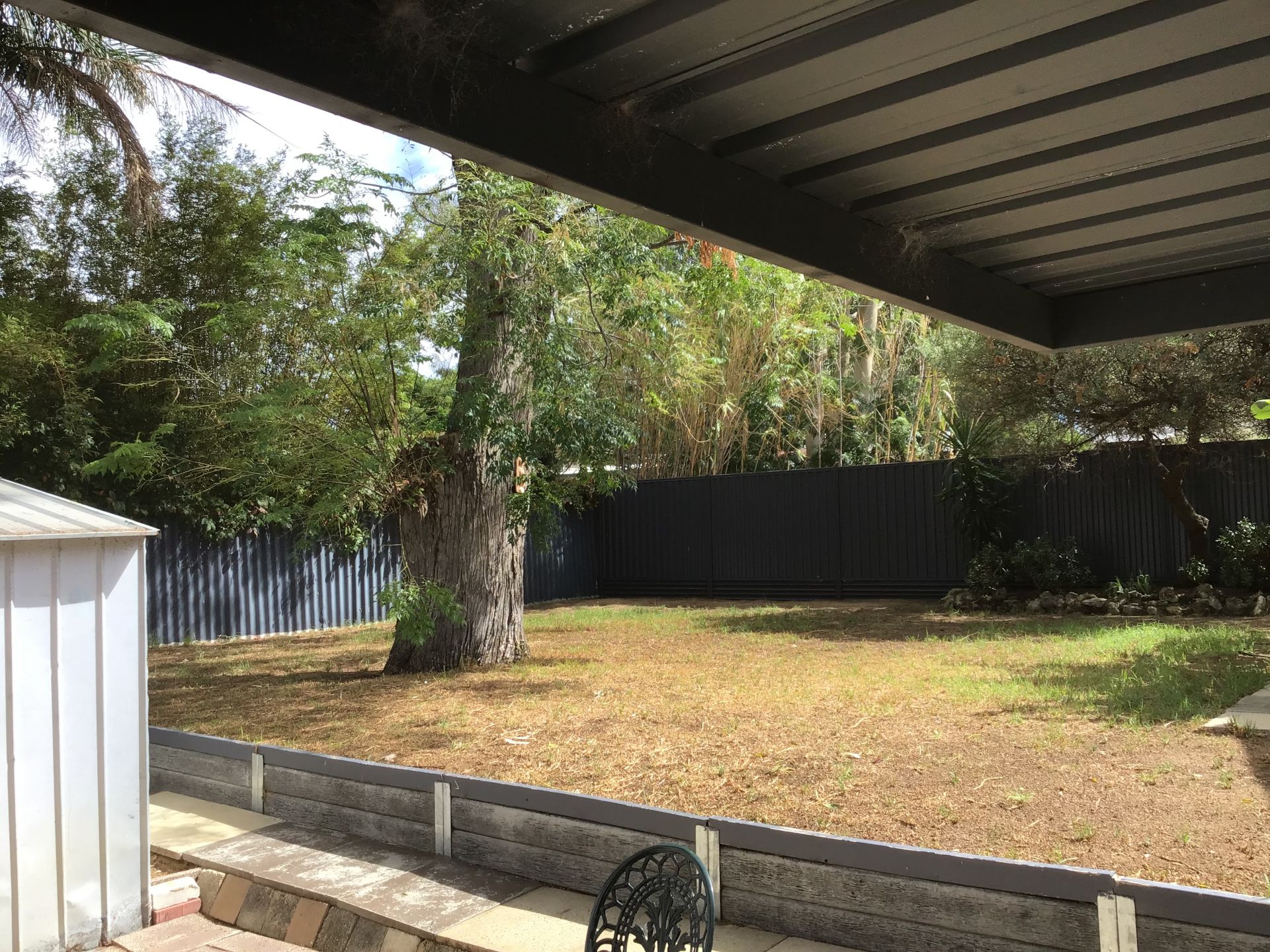 Huge back yard, garden shed and two carports.