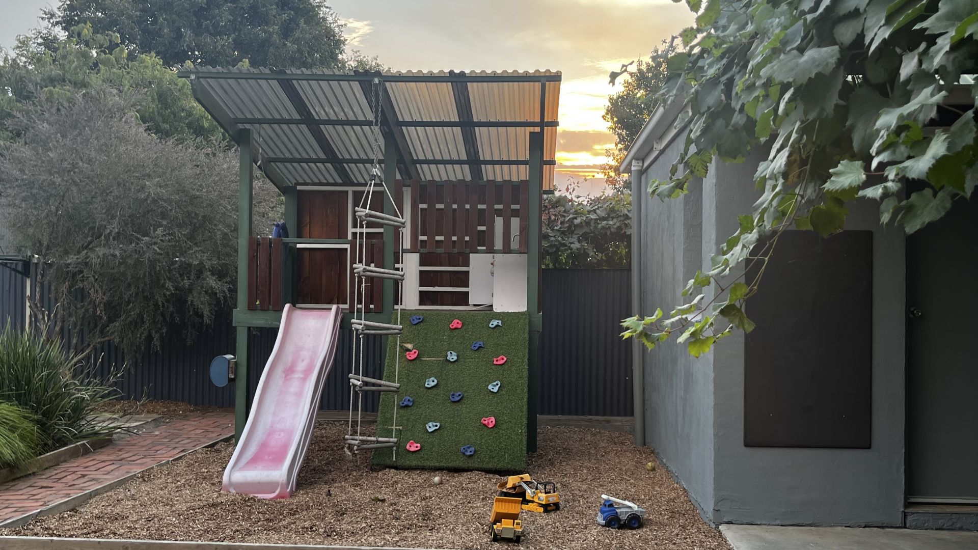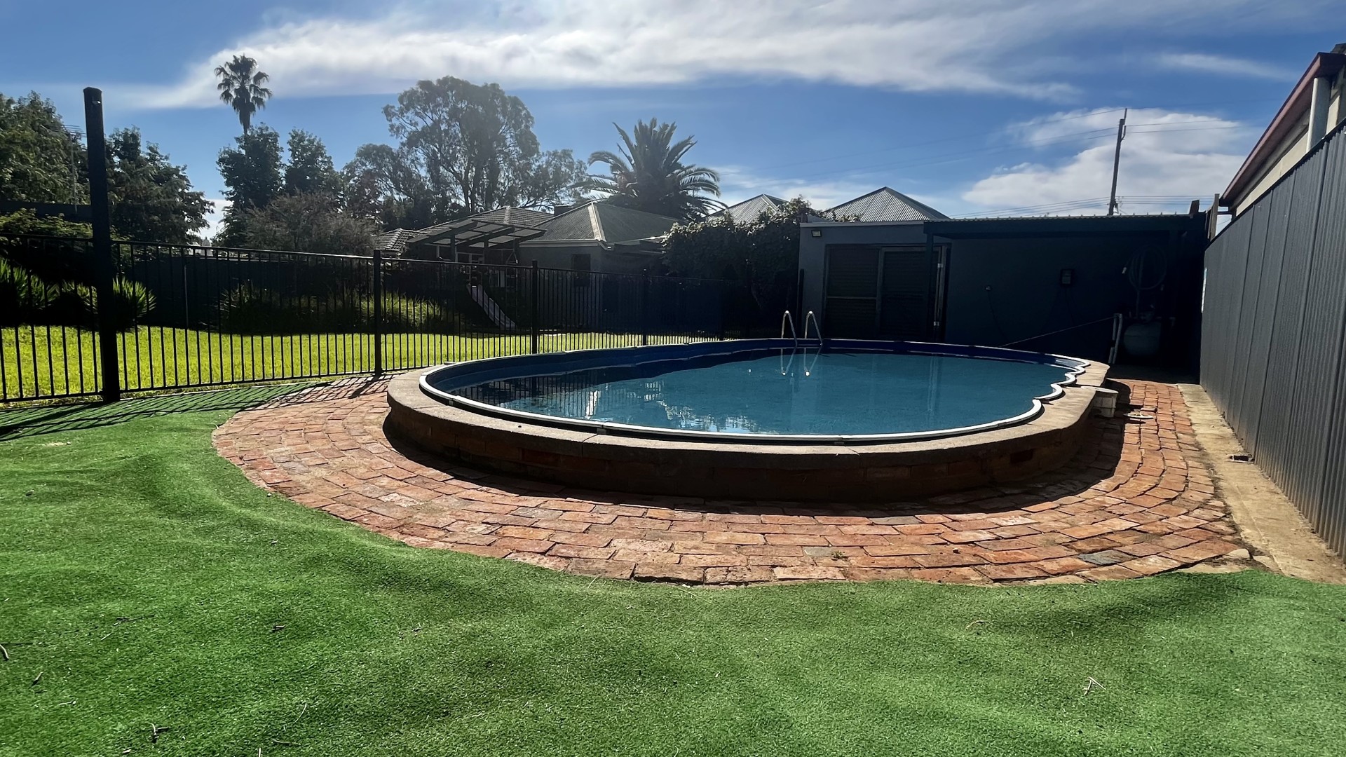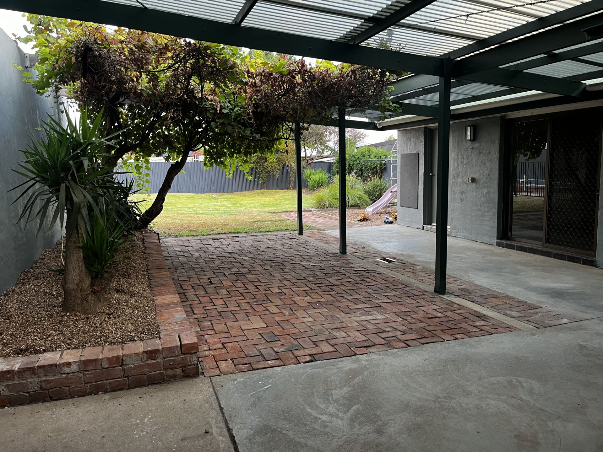 Outdoors there is an amazing kids area and an ornamental grapevine over a red brick paved entertaining area. The grape vine provides exceptional cool shade for outdoor dining during the summer months as you relax by the pool with family and friends