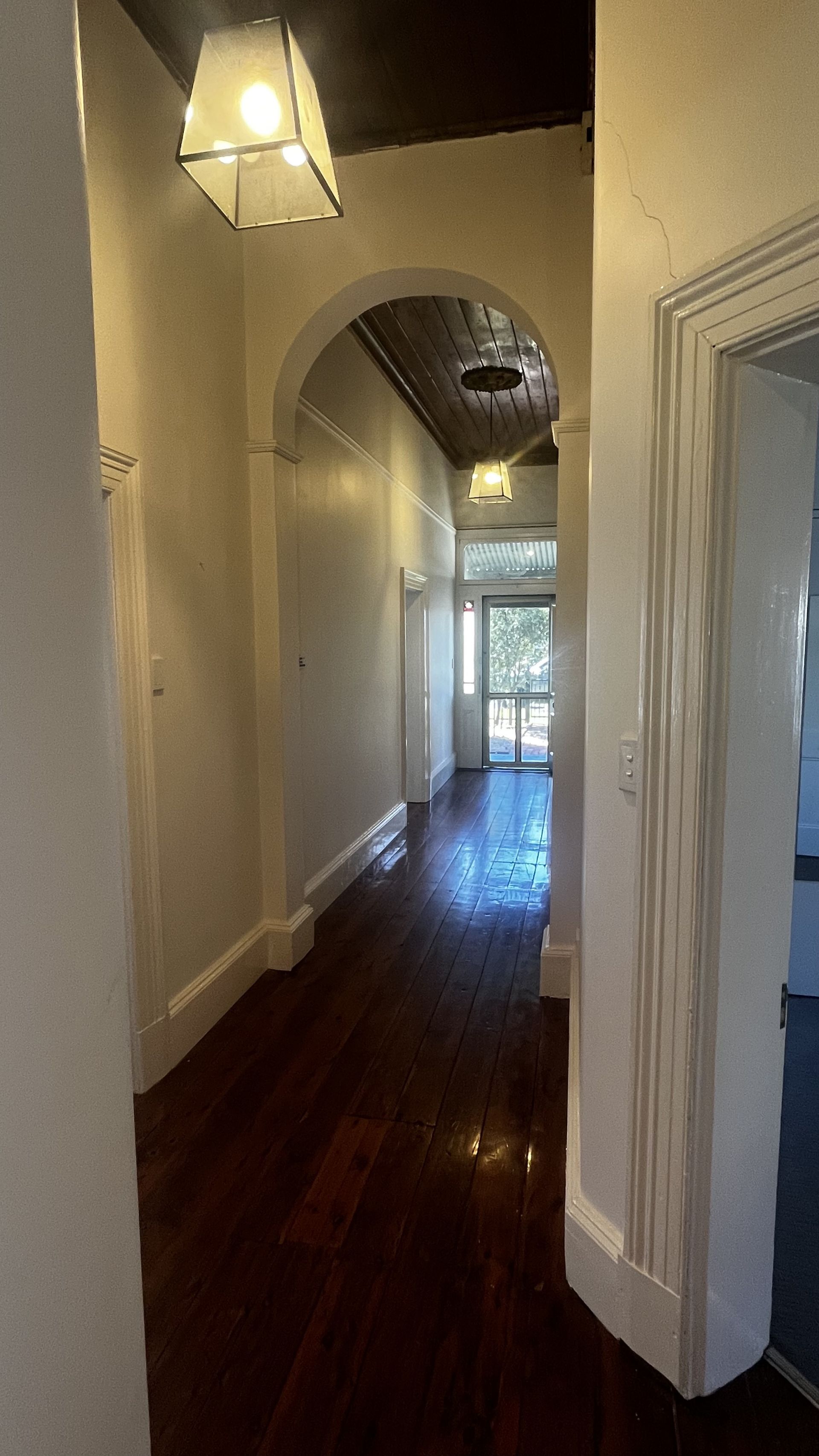 Once you enter through the original solid timber front door with its etched and stained glass side lights, you will be drawn in by the 13ft ceilings and wide hallway with original Murray timber floorboards.