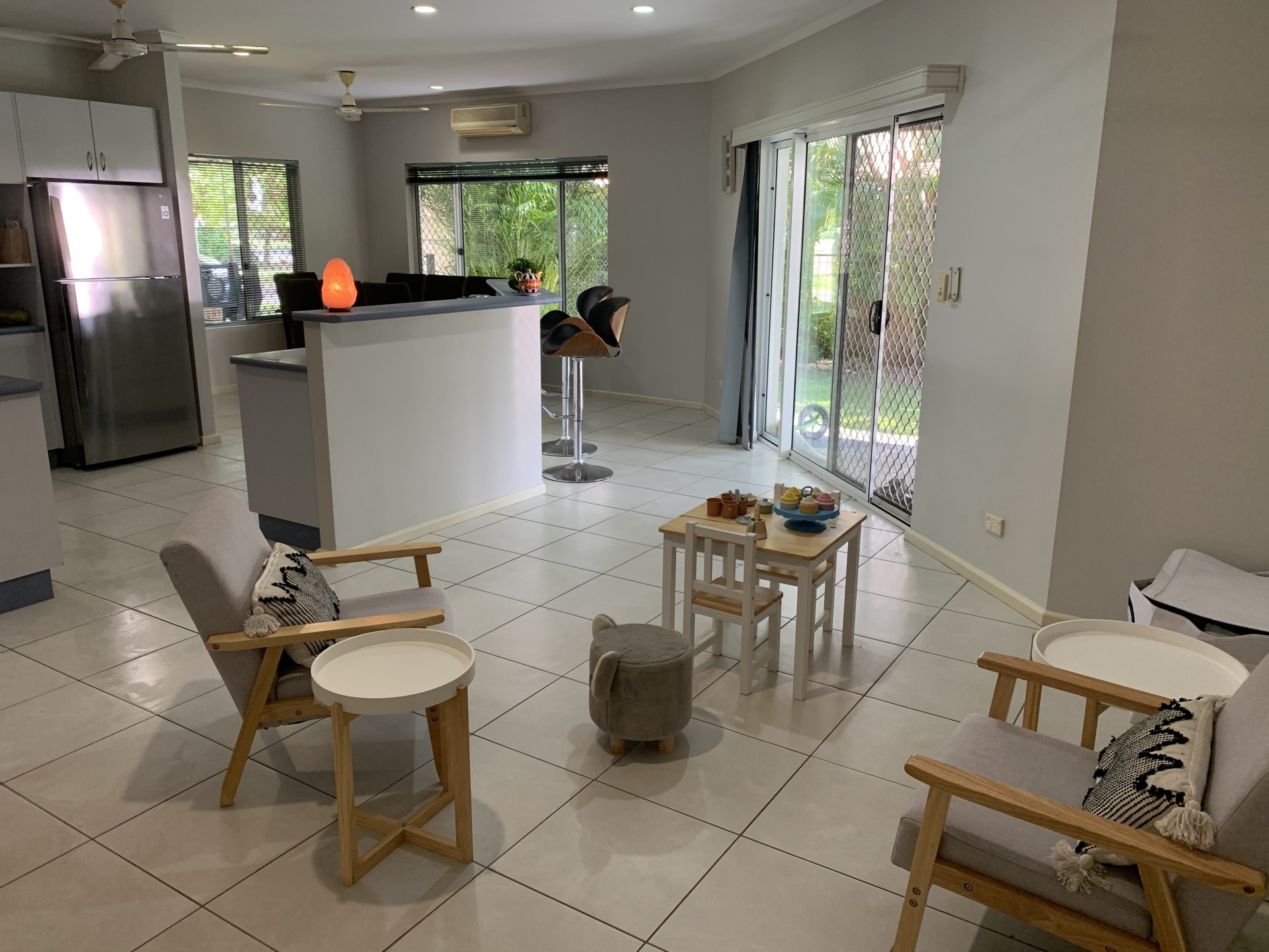 - This three bedroom home is fully air-conditioned with a living room, lounge and dining area that surround the kitchen space.