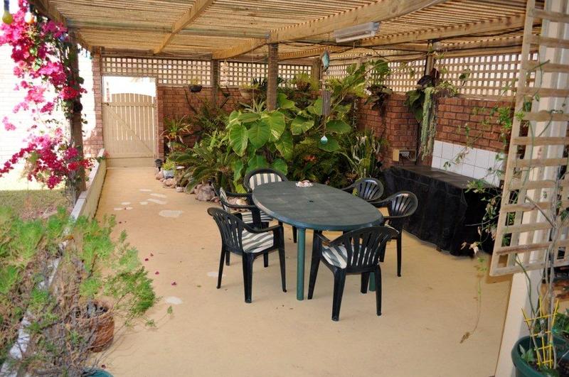 Delightful cool outdoor sitting area with fishpond and fernery, sheltered from prevailing winds and fully enclosed for children or pets.