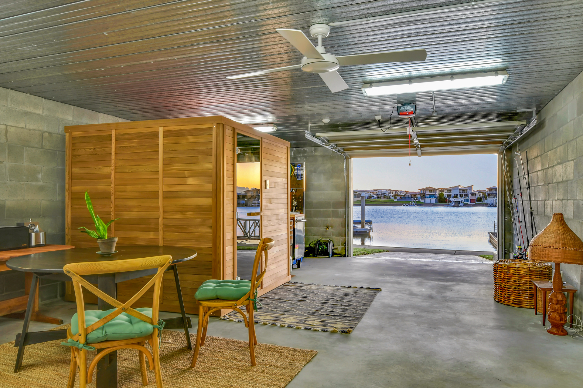 Outdoors, the magic continues. A large, covered northwest-facing balcony offers uninterrupted sunset views, while a traditional Finnish cedar sauna promises year-round relaxation. The home is equipped for comfort with ducted air conditioning plus additional split systems.