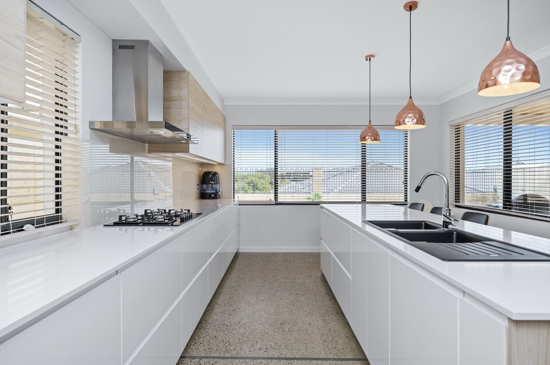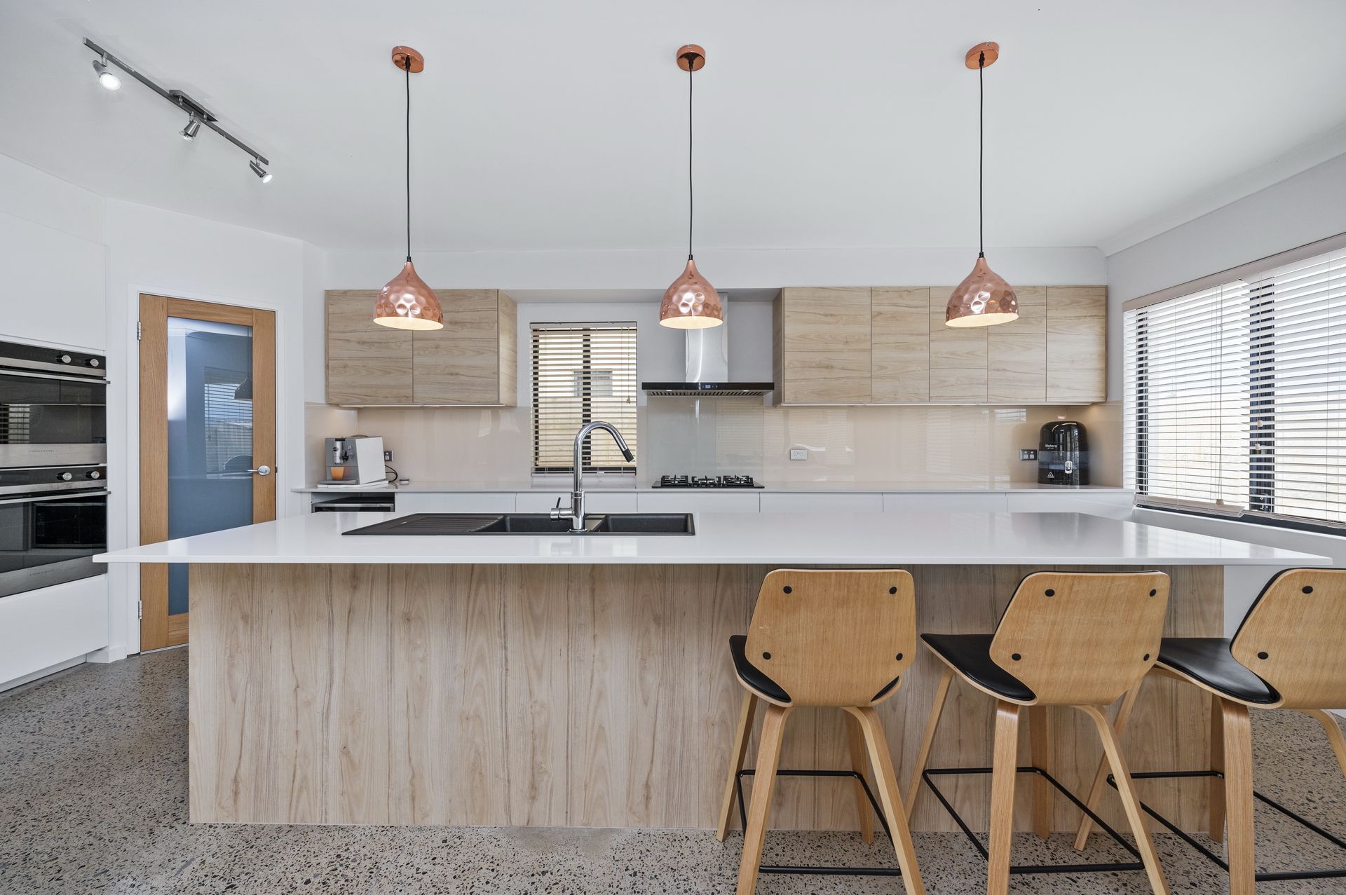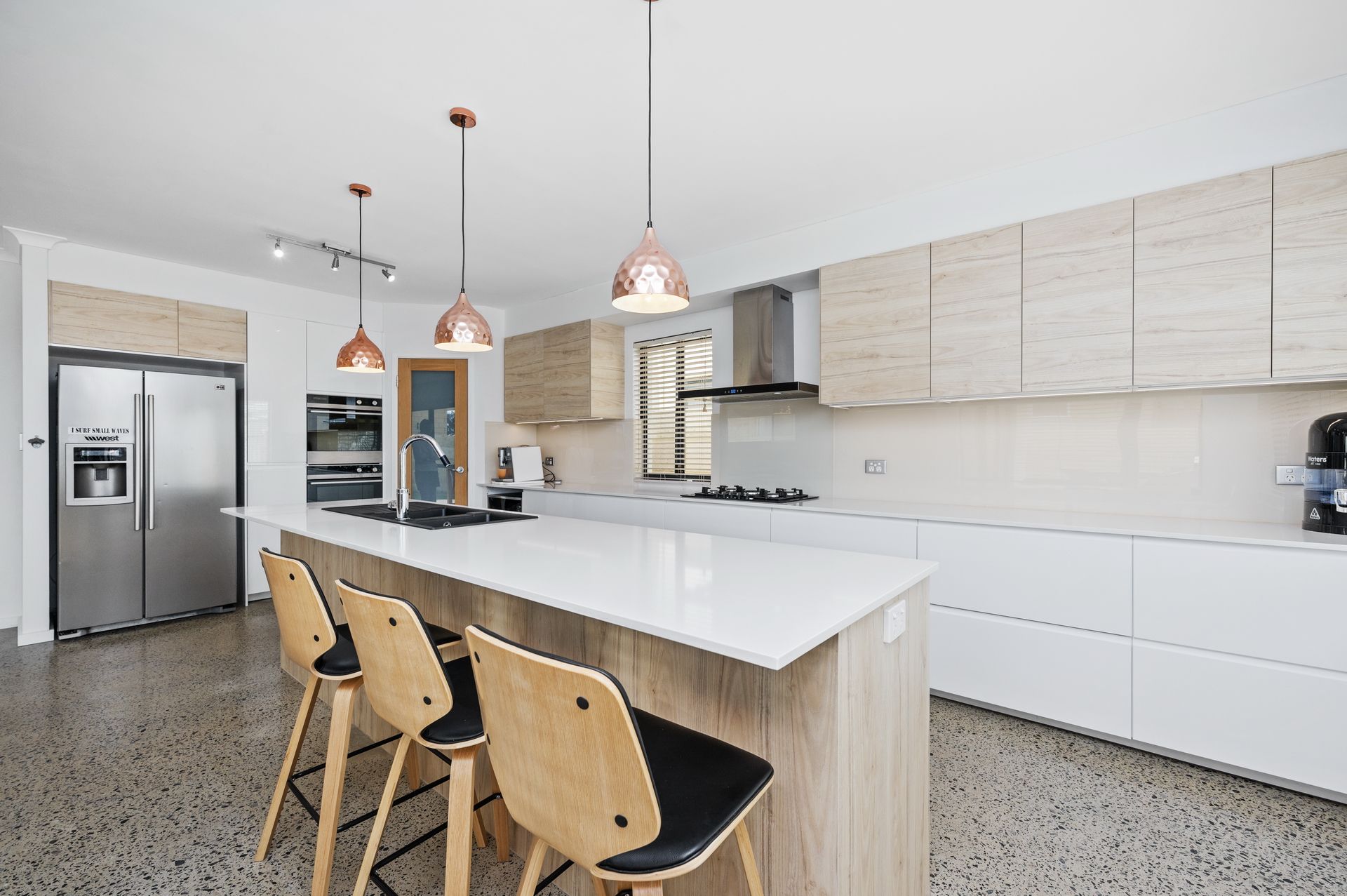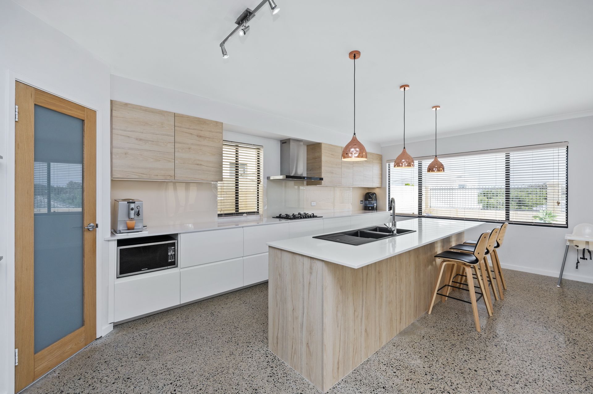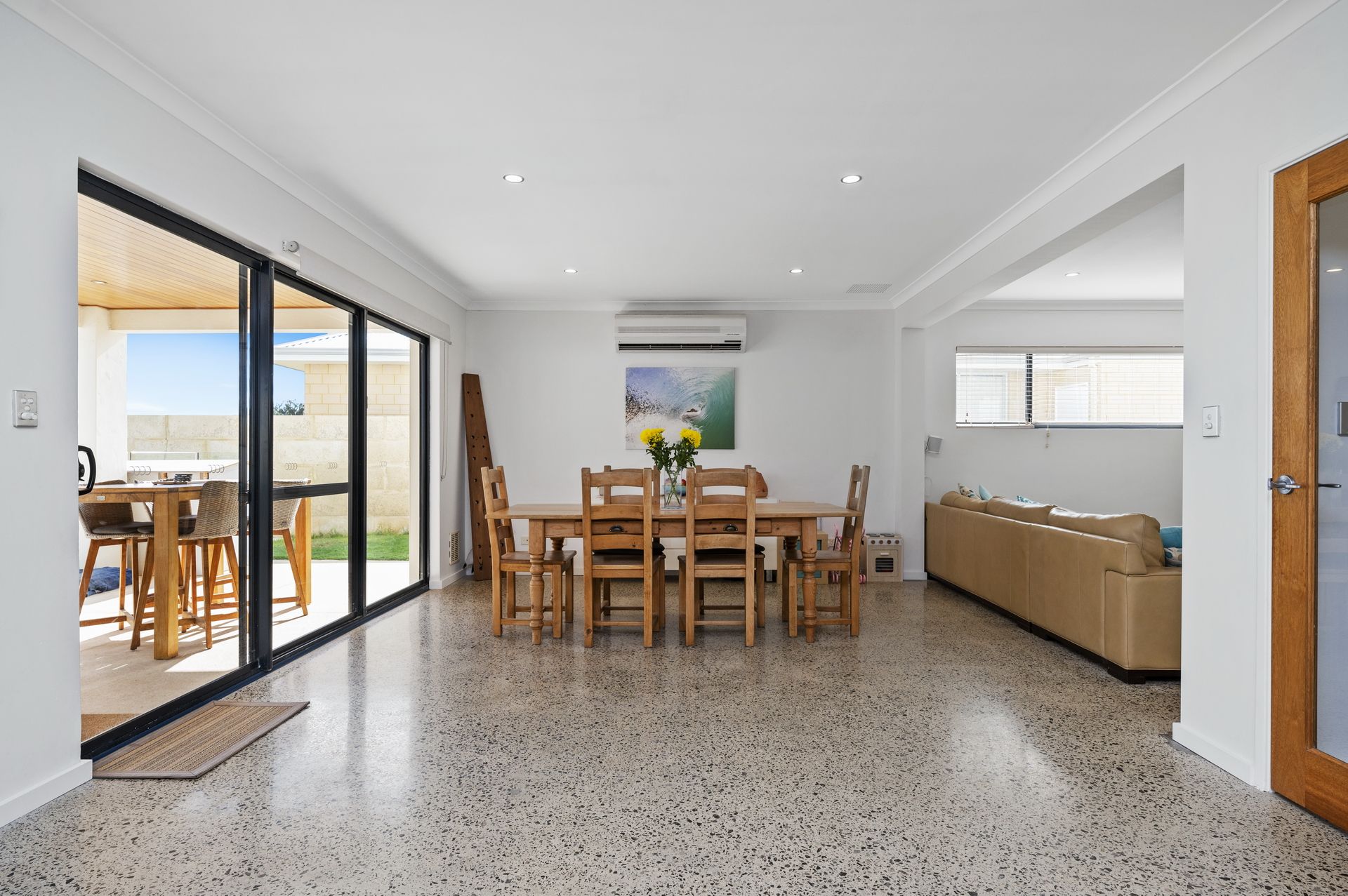 Large, contemporary living area with polished concrete and stone benchtops