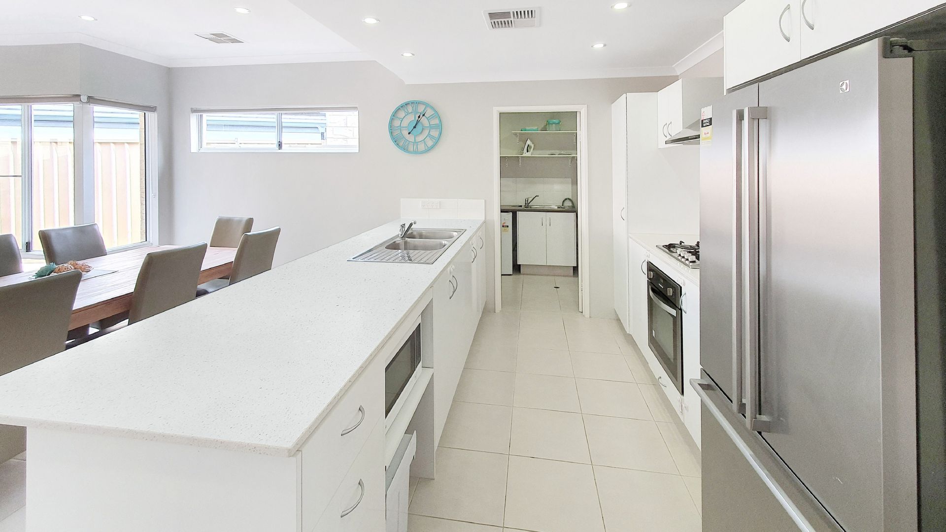 - Wall oven with 4x gas hot plates tiled splashback, rangehood, pantry and double fridge recess.