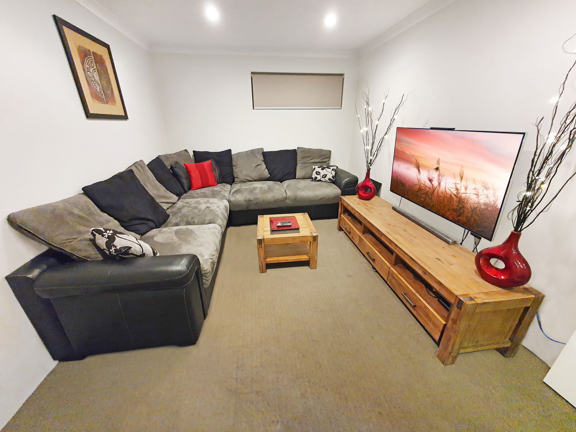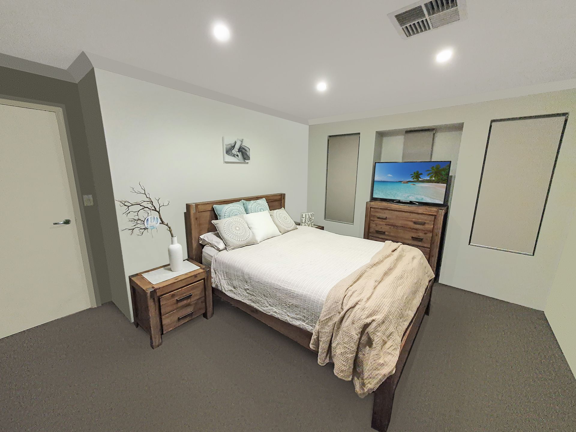 - Tiled flooring in living areas; carpeted bedrooms