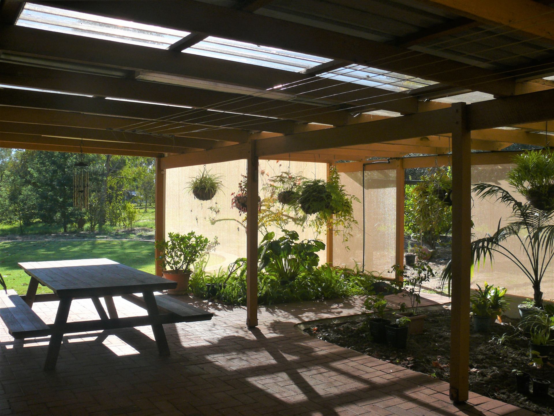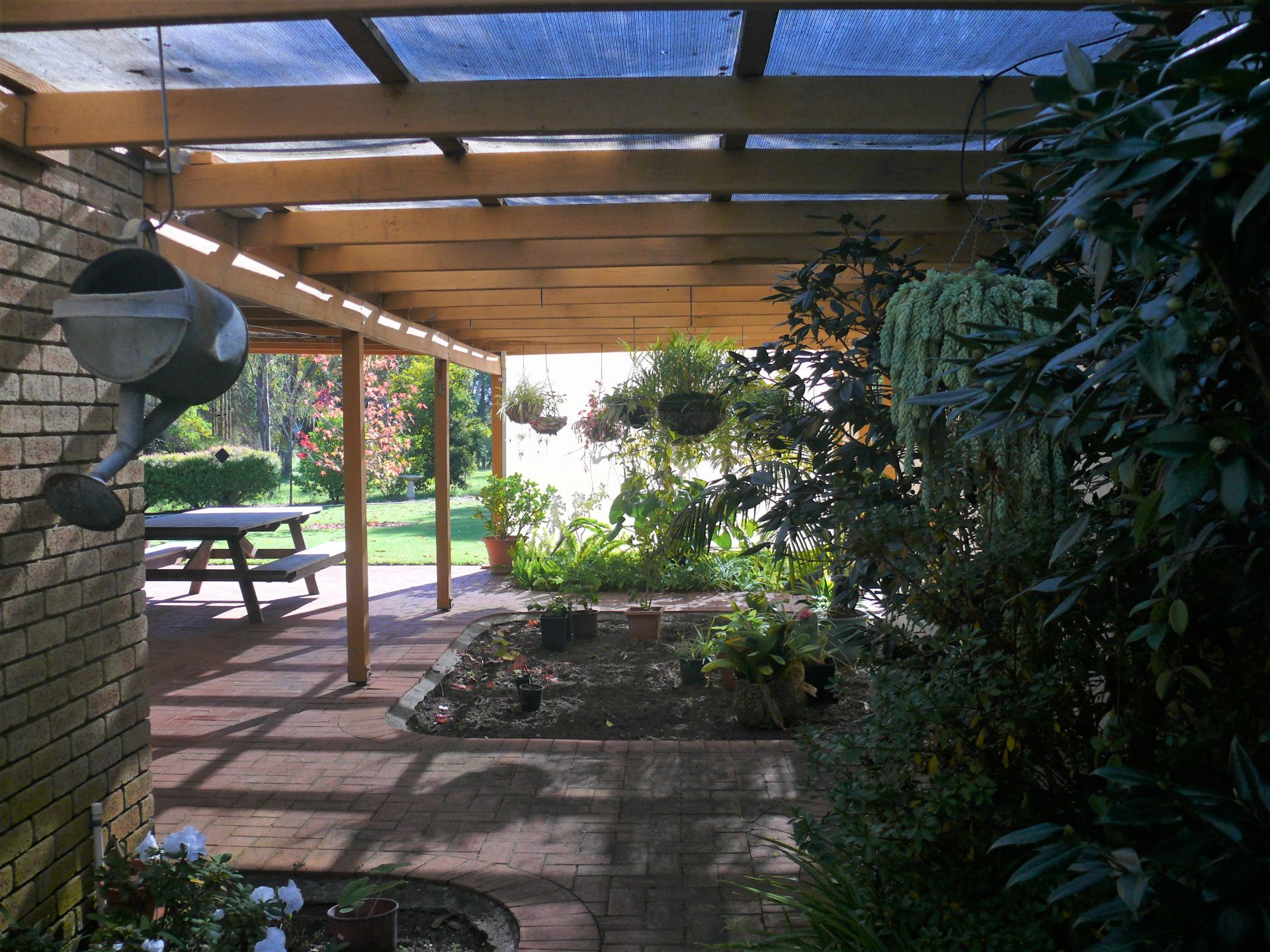 Outside there is a large paved patio area with adjoining shaded area for plants, a double brick and tile single garage, a lockup workshop and extensive undercover parking and storage for cars and toys.