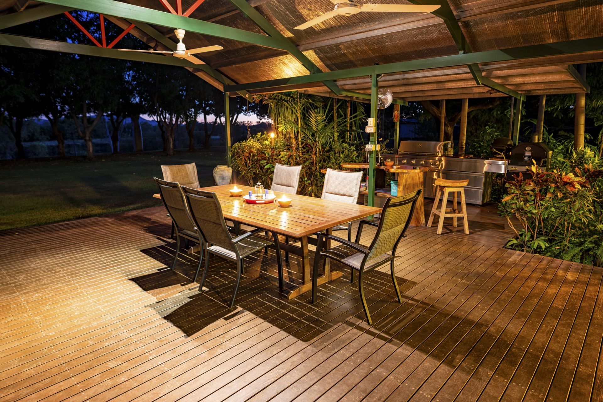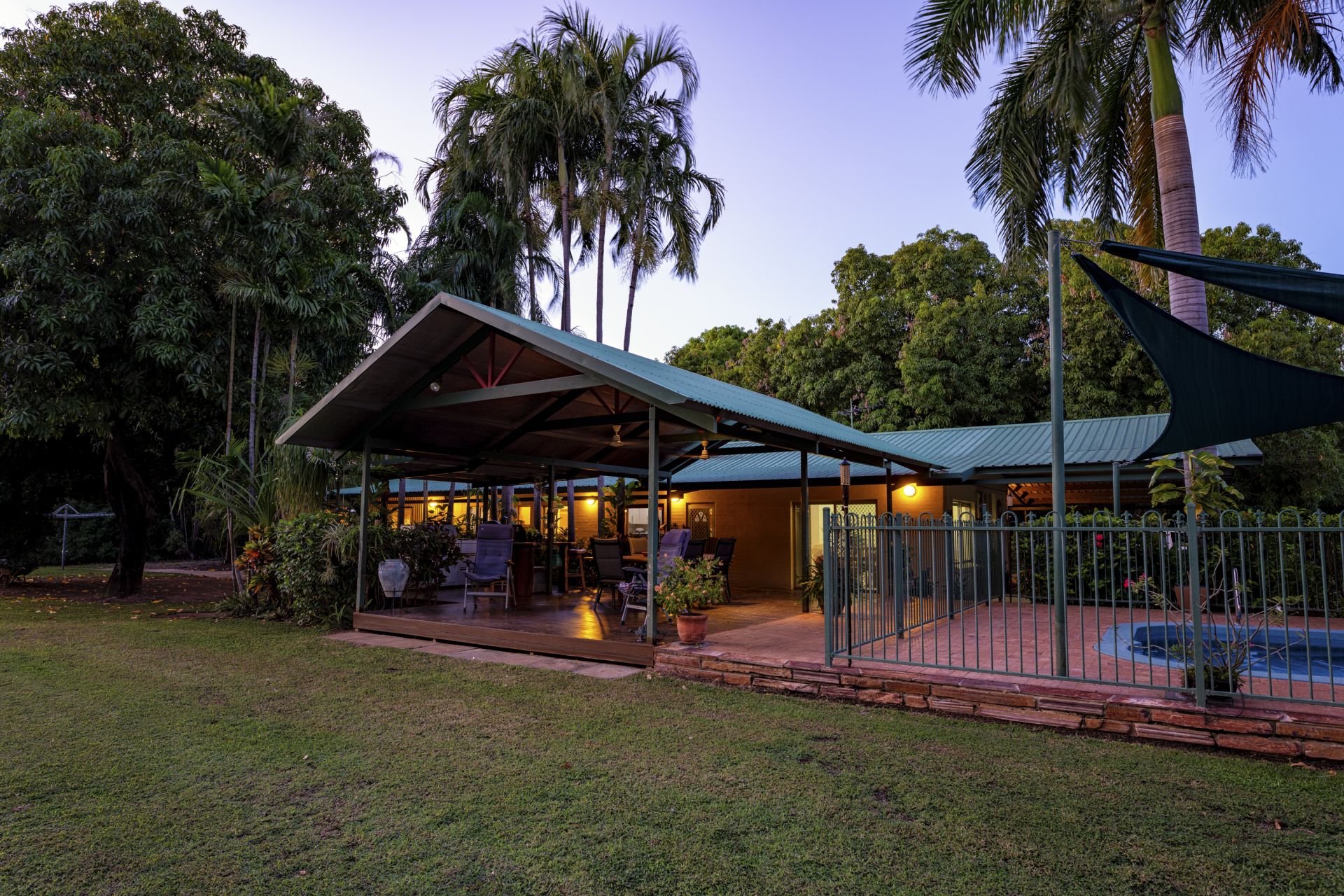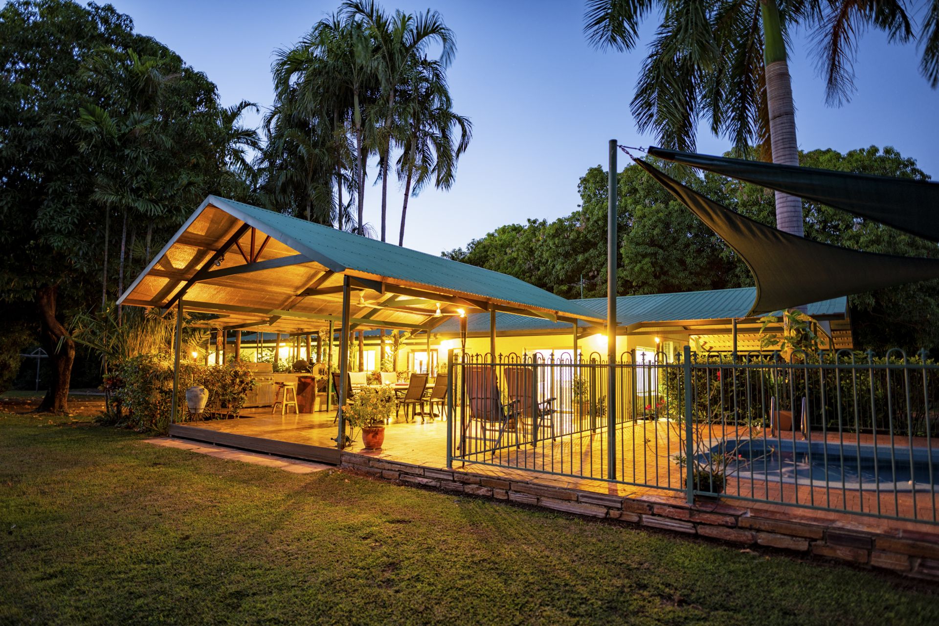 - Entertaining deck with BBQ kitchen adjacent to b/g saltwater swimming pool with shade sails set in tropical gardens
