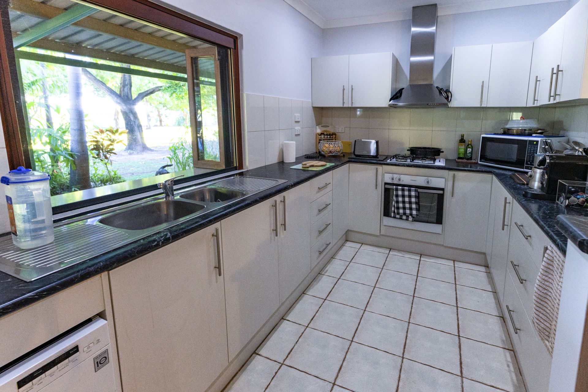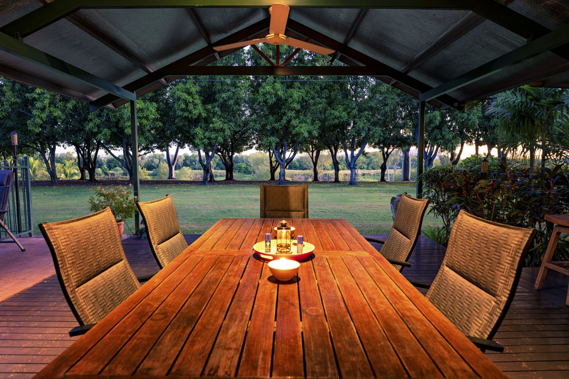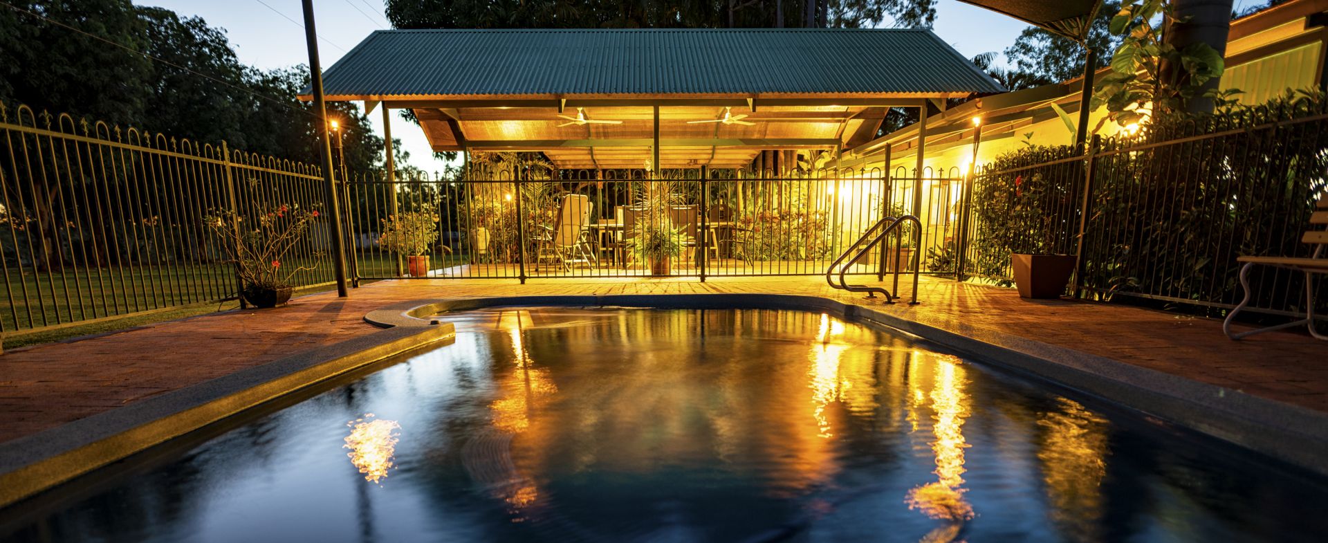 - Entertaining deck with BBQ kitchen adjacent to b/g saltwater swimming pool with shade sails set in tropical gardens