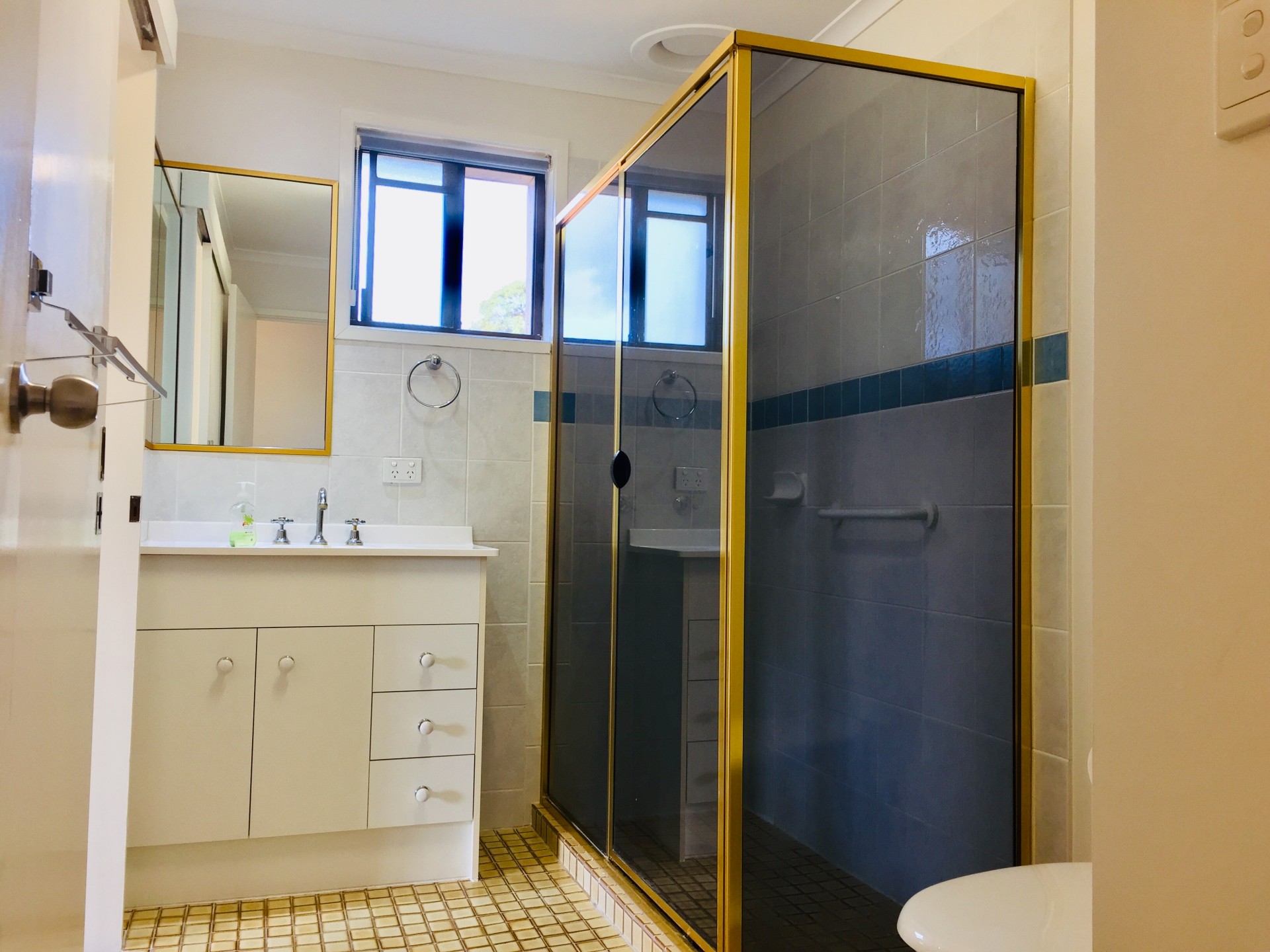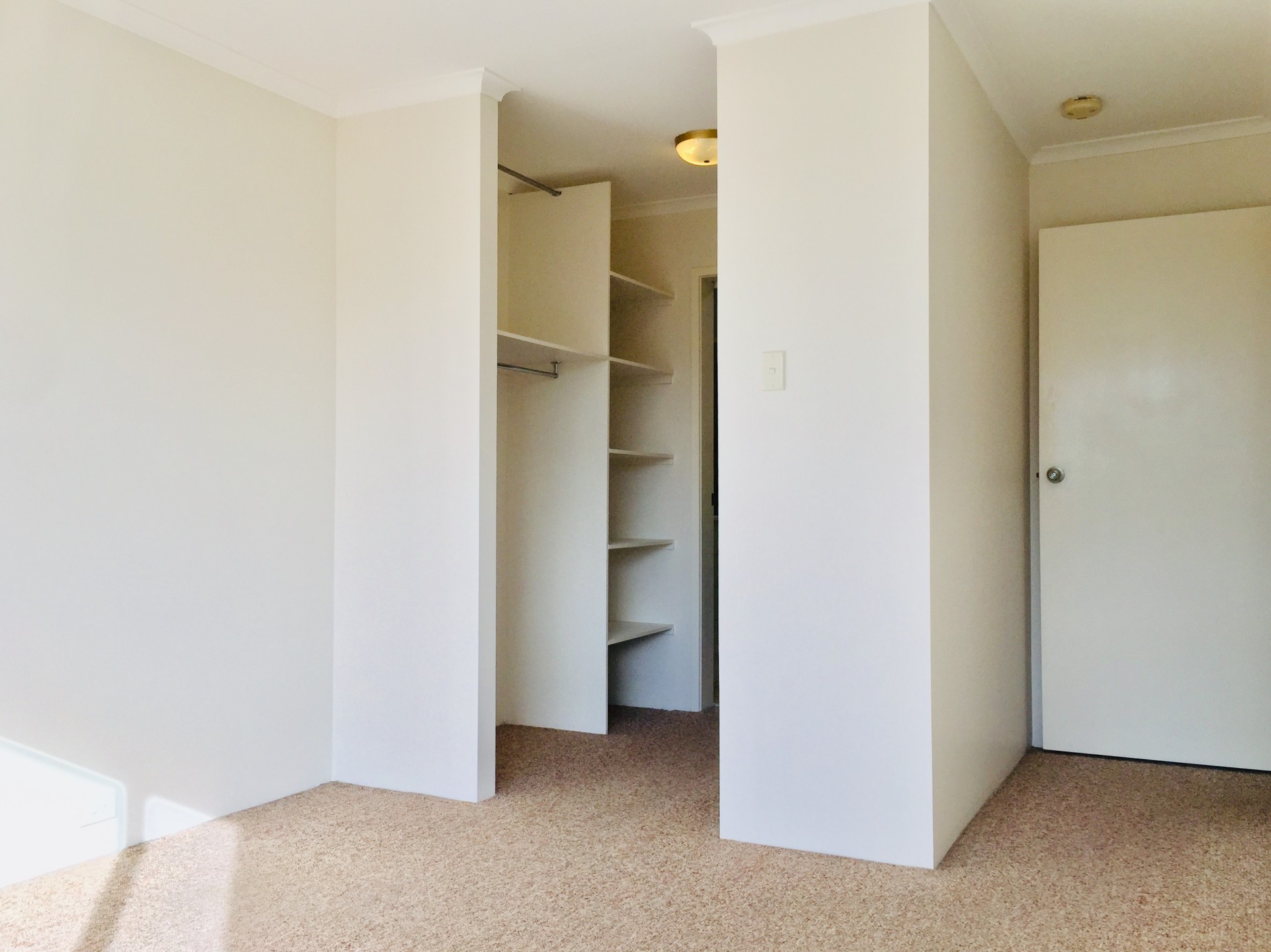 In between the bedrooms is a walk in robe and a bathroom with a toilet/vanity/shower.