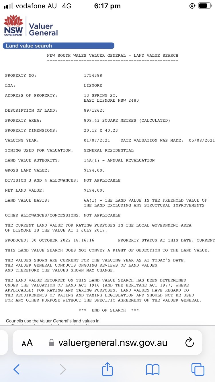 The Valuer General Land Value estimate is $194k.