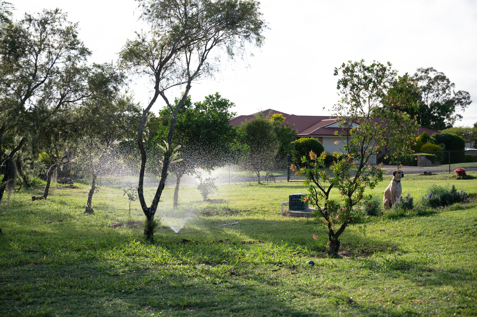 A Hose-Link system covers the entire property and recyled septic water waters the fruit trees.