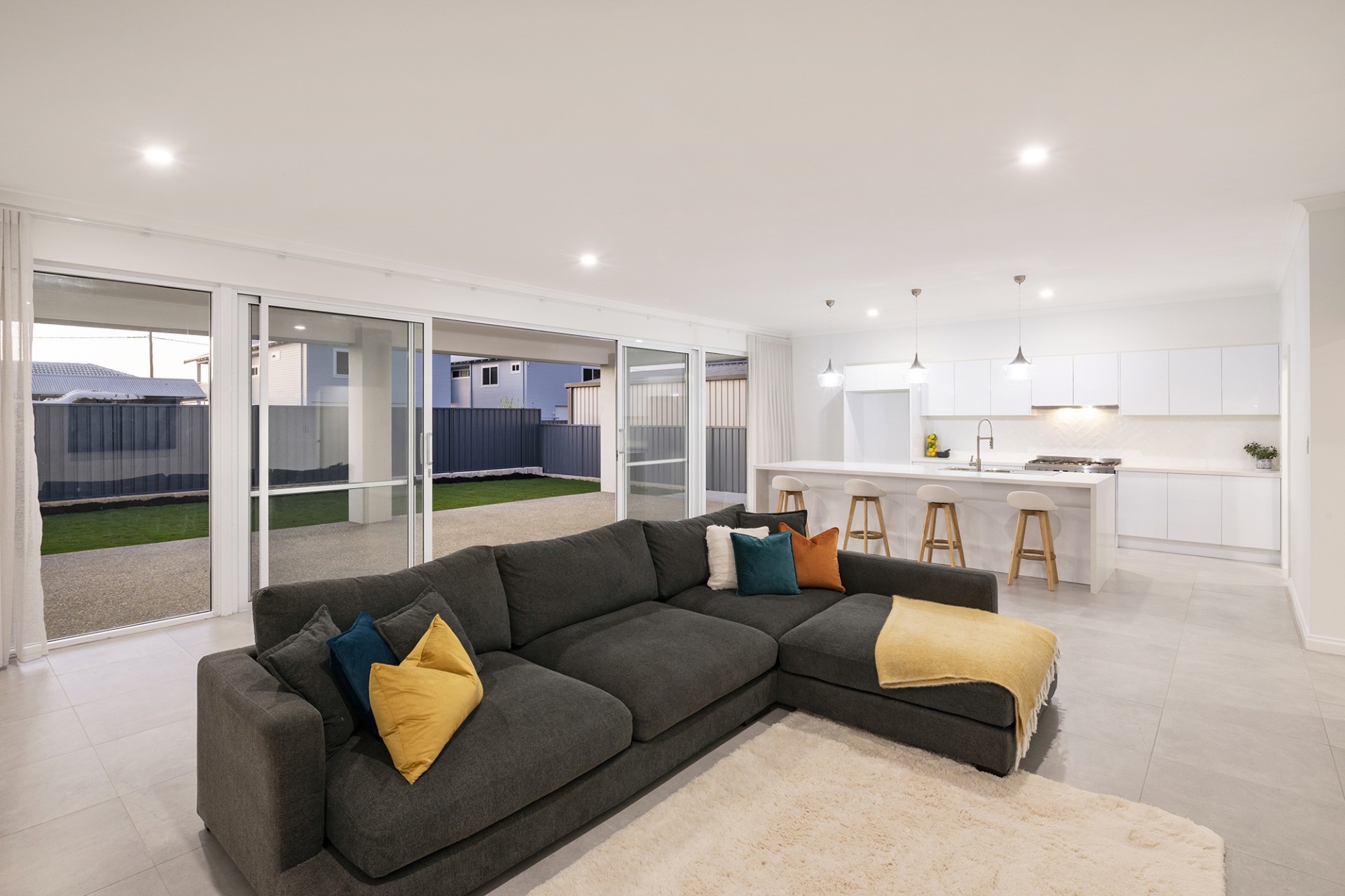 The open plan living, dining and kitchen area is amplified by enormous commercial grade sliders opening widely onto a raised 41 sqm alfresco, overlooking freshly laid turf with a garden bed that is ready for you to design to your own tastes.
