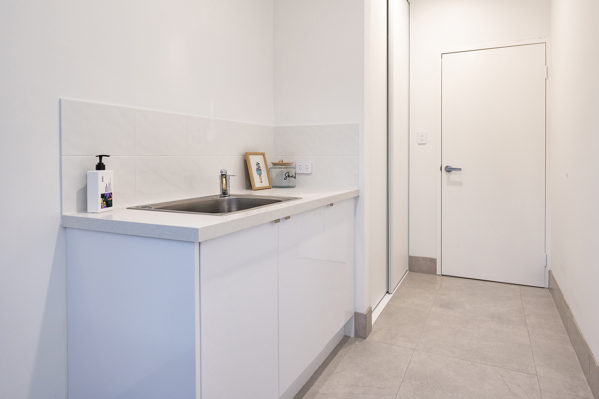 - Laundry is fitted with cupboard space that has built in laundry hampers, stone benchtop