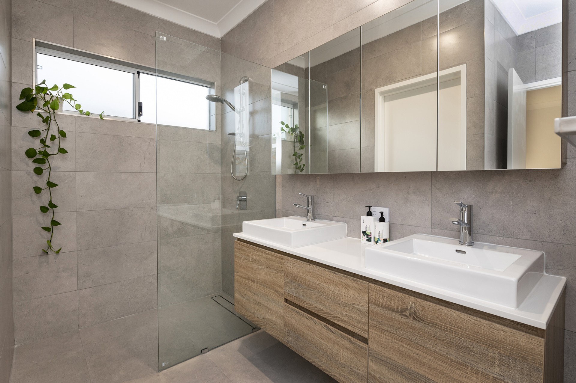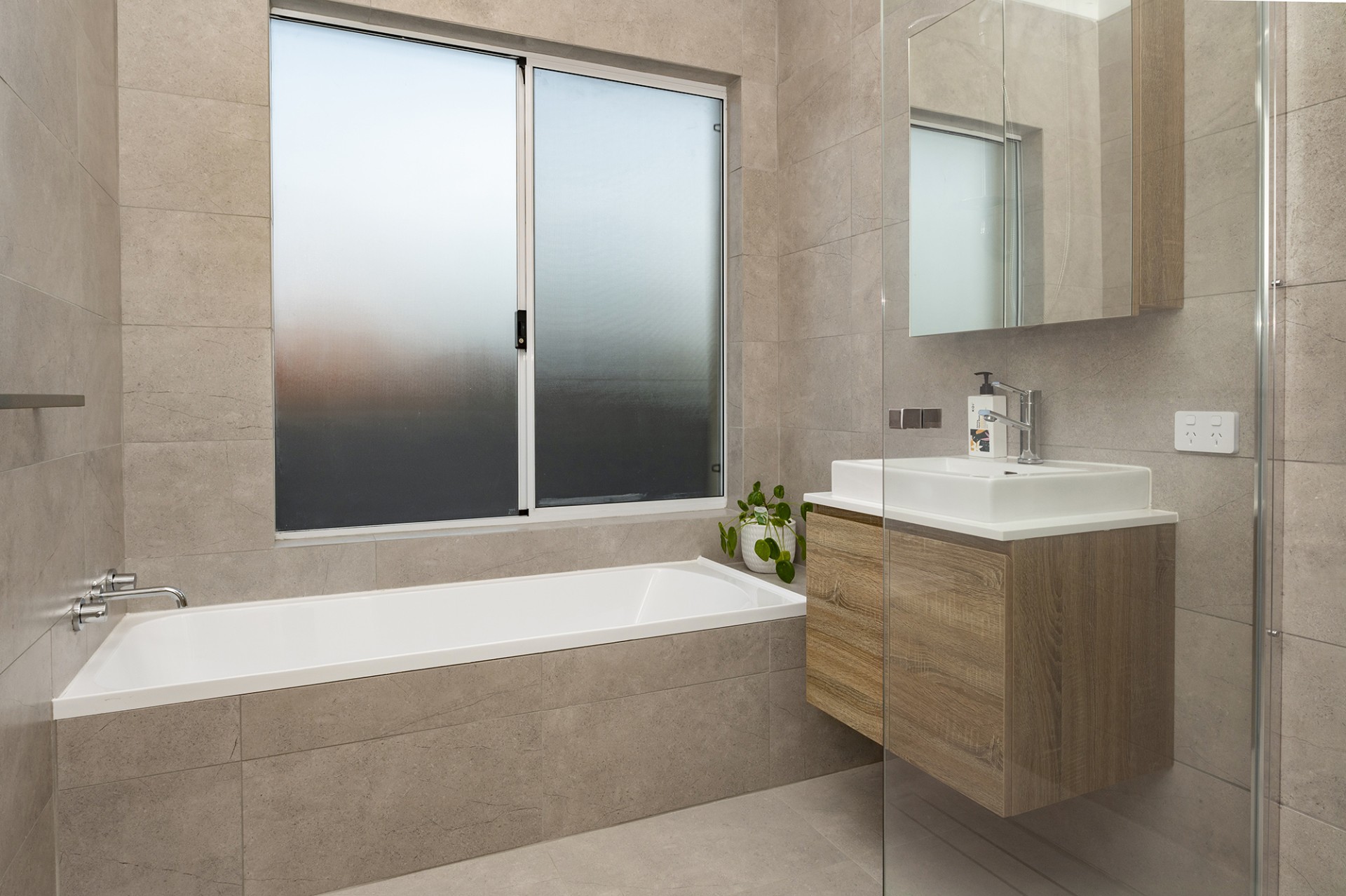 - Main bathroom has floor to ceiling tiling, semi-frameless shower, bath, floating vanity and