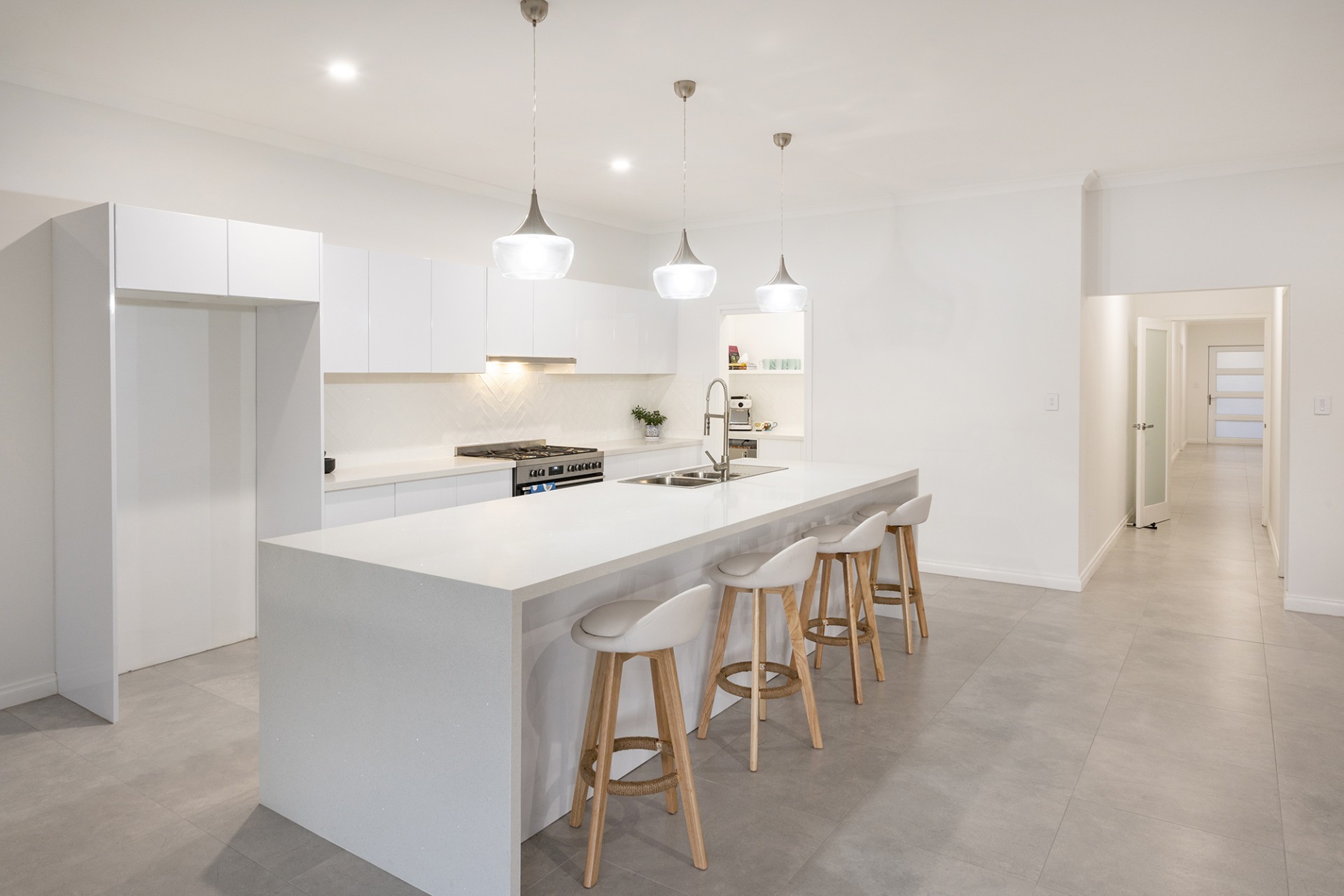 The front elevation fits nicely with its surroundings in a coastal theme coupled with limestone retaining walls, extensive exposed aggregate driveways and freshly laid turf which leads up to a 1.2m front entrance. It is evident once you step inside the light filled interior that high ceilings are feature, complimented by a colour palette of whites and greys that will appeal to all tastes and make decorating a breeze.
