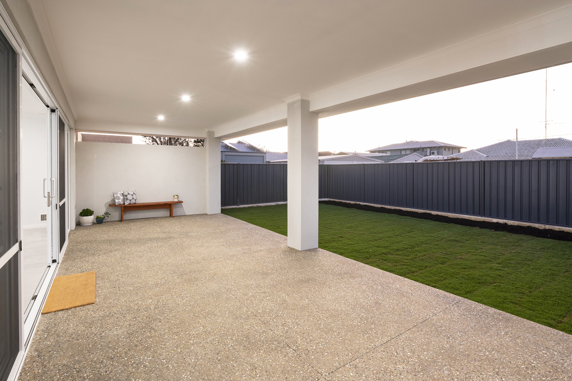 - North facing and raised 41sqm alfresco & entertaining area laid in exposed aggregate