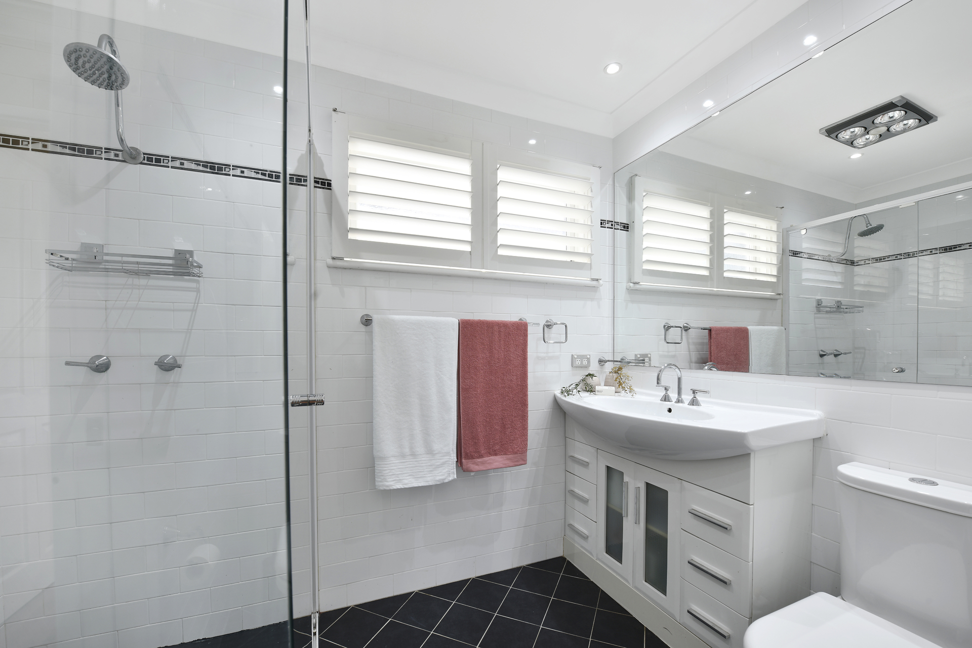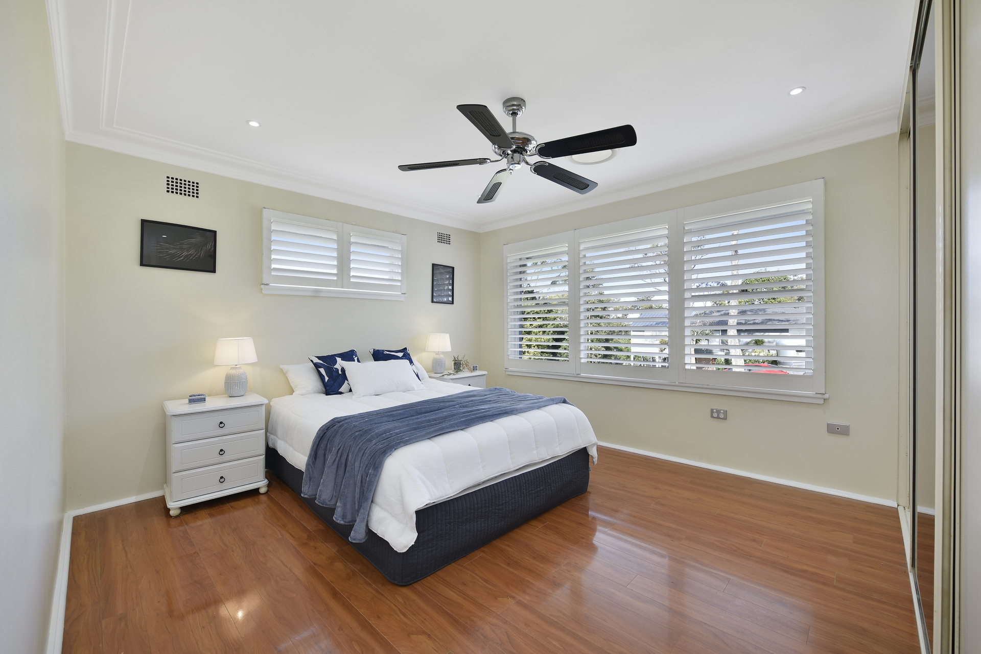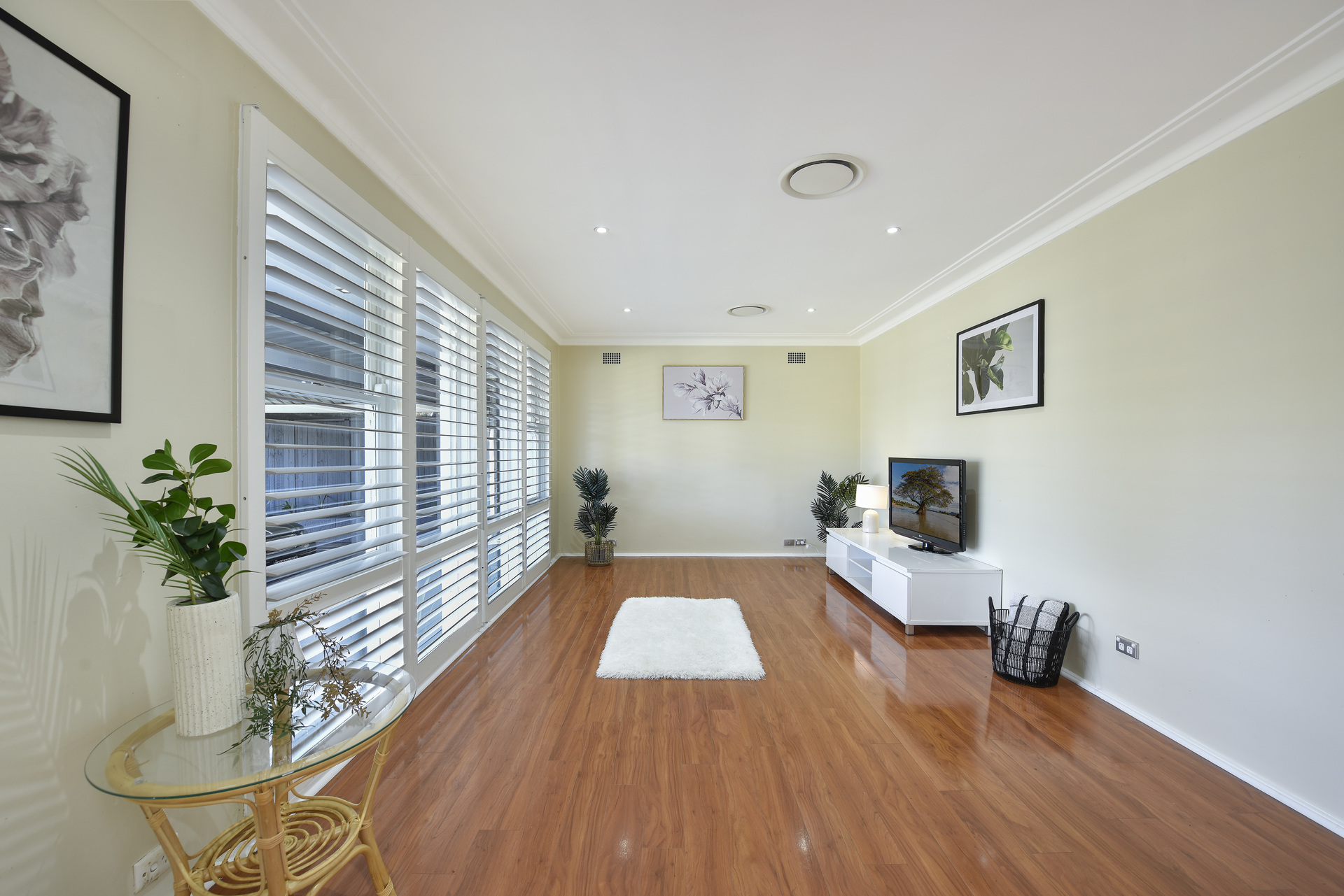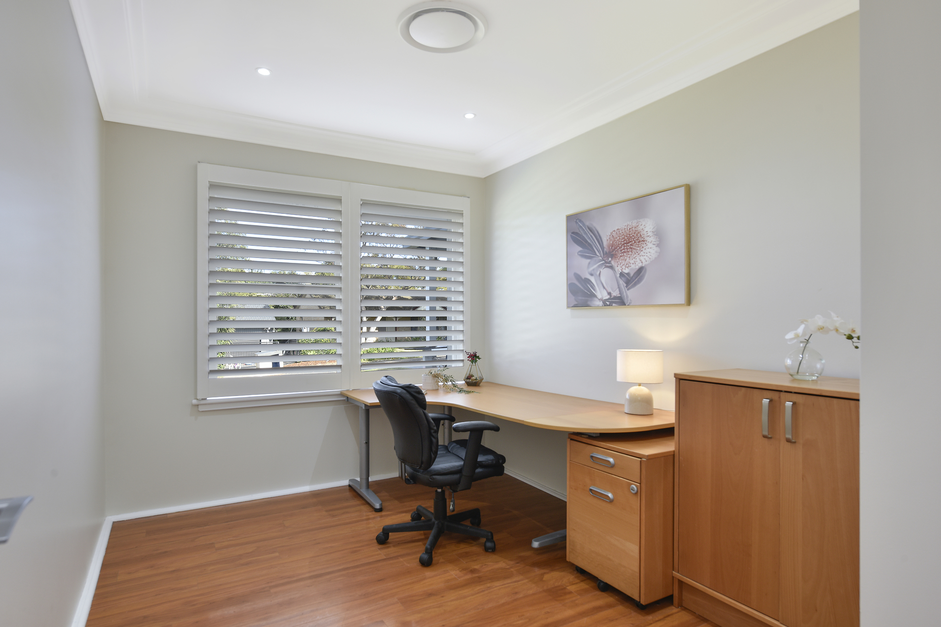 Modern down lighting and stylish plantation shutters.