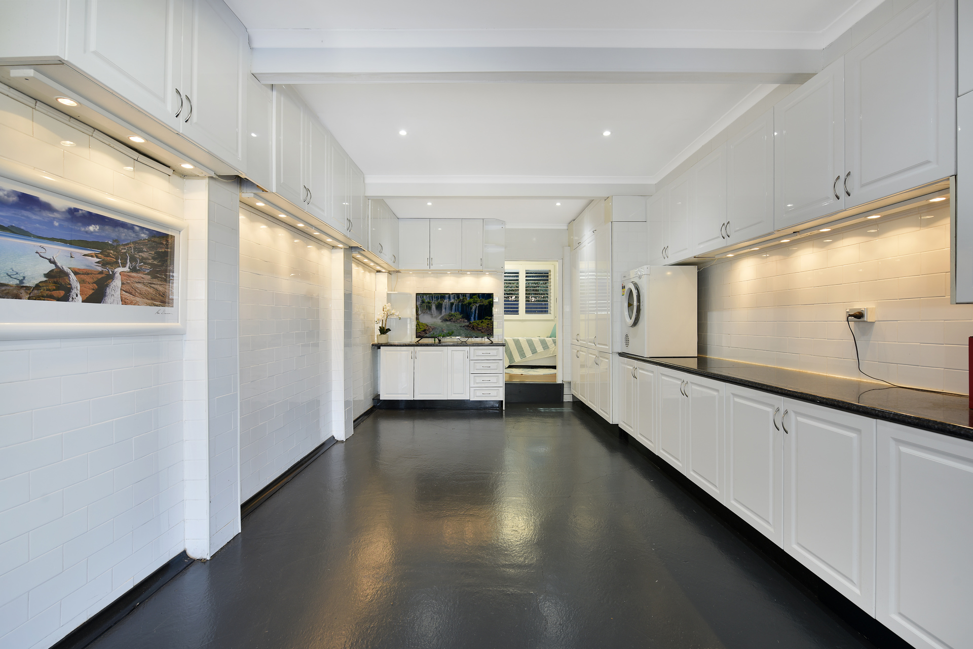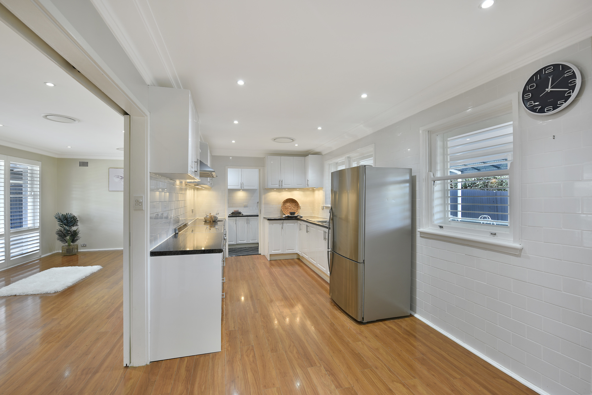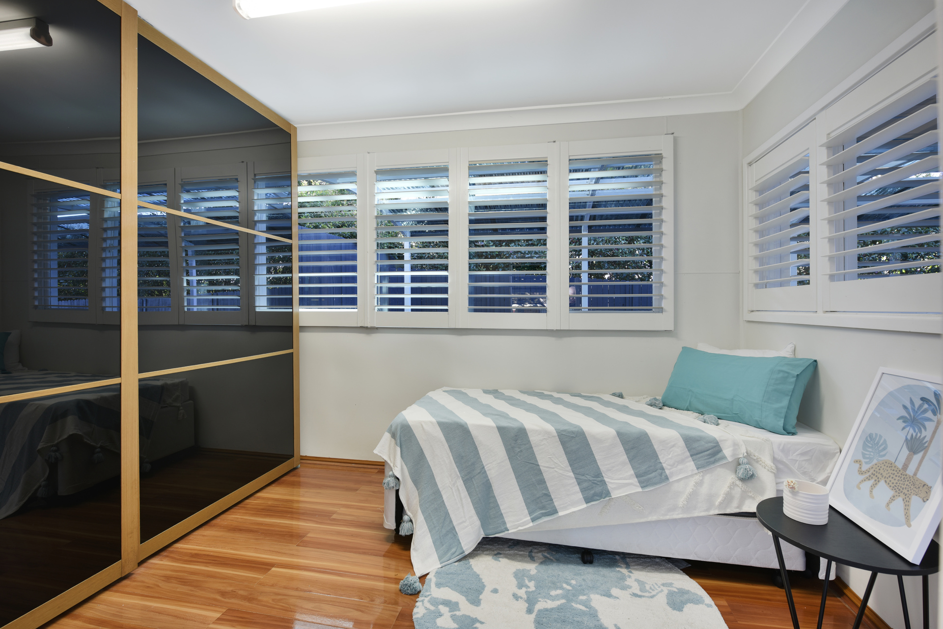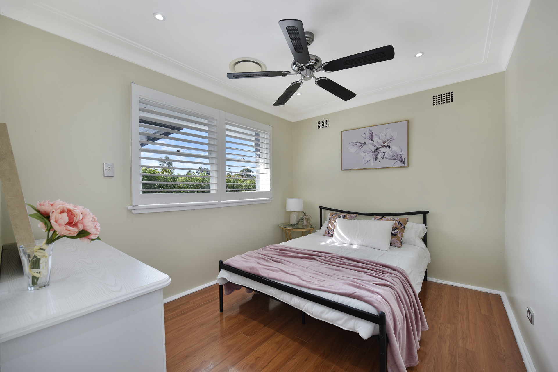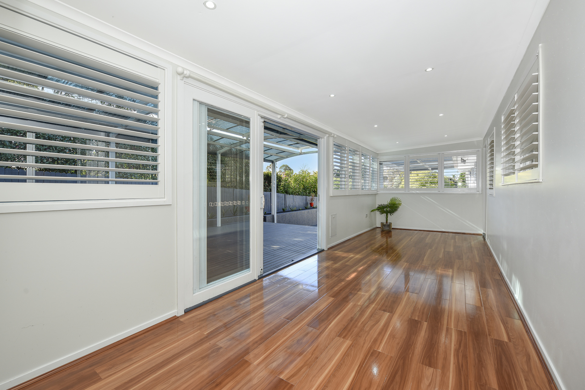 Modern down lighting and stylish plantation shutters.