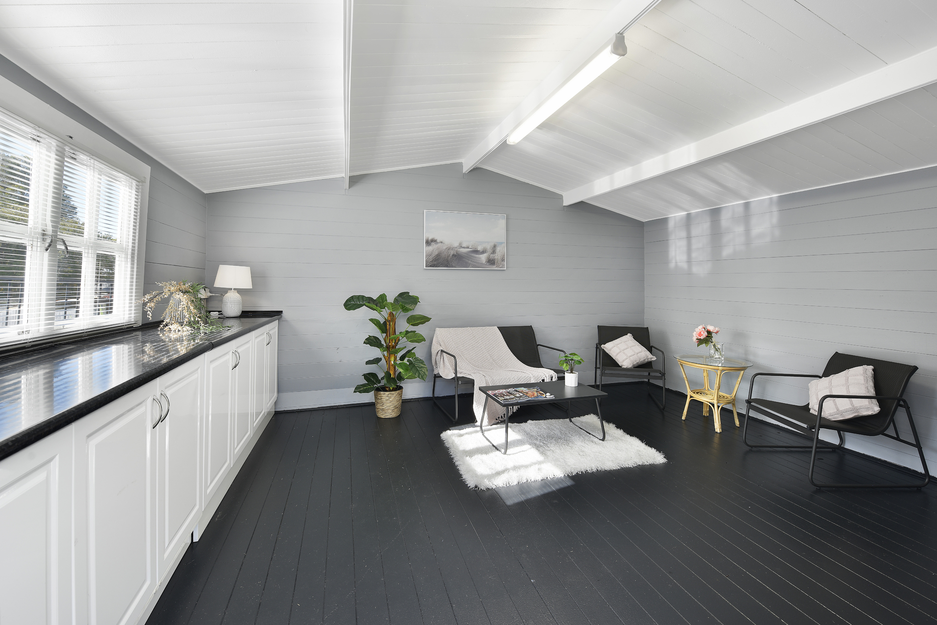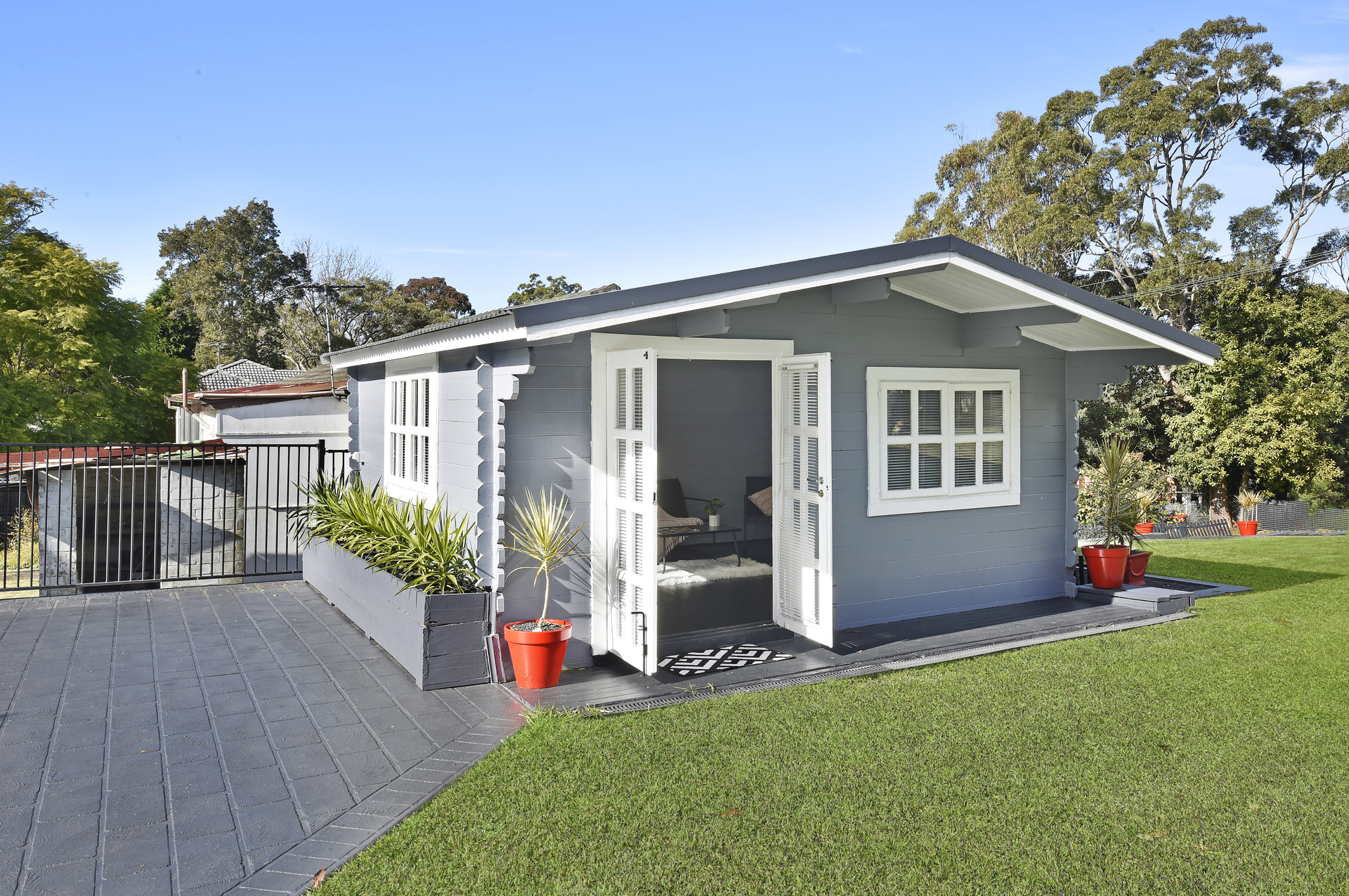Separate office, teenage retreat or workshop with built-in storage and power.