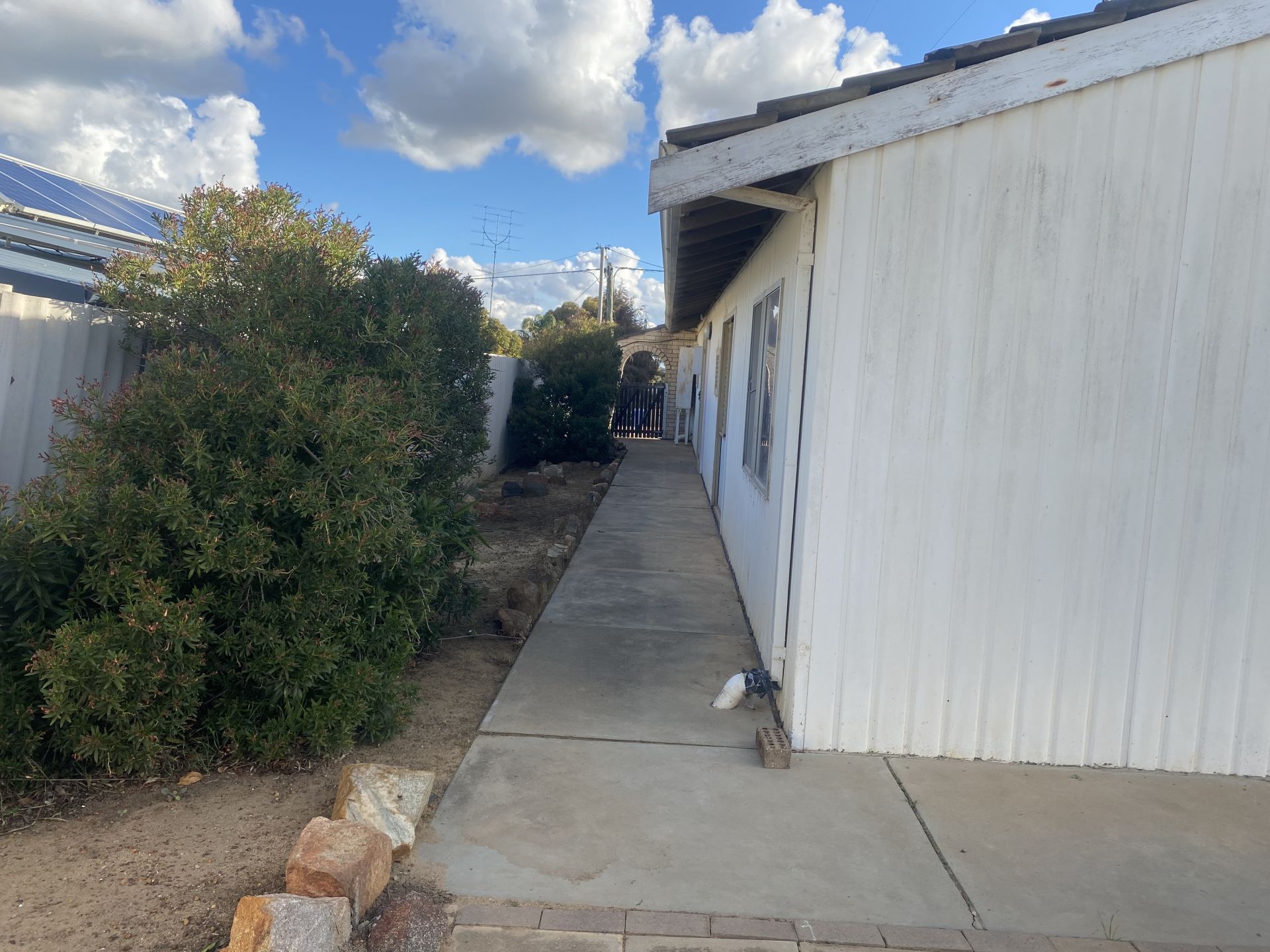 Low maintenance reticulated gardens including fruit trees and a grape vine, large garden shed and two large water tanks.
