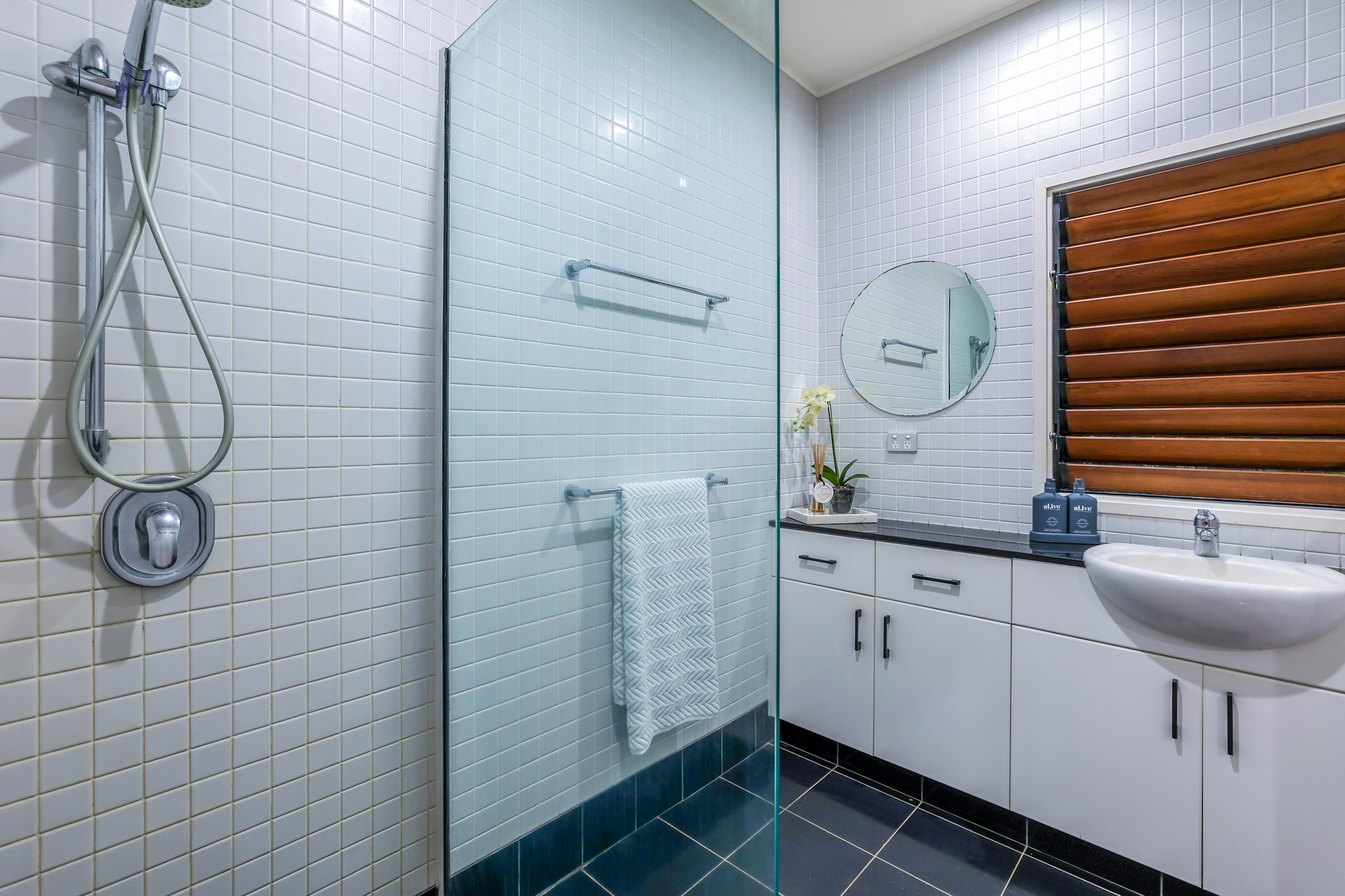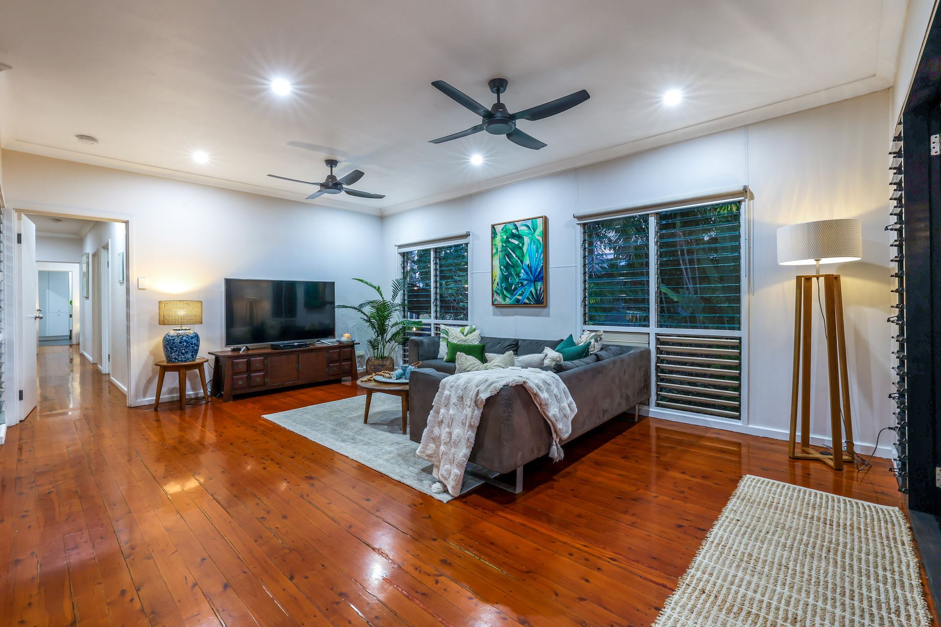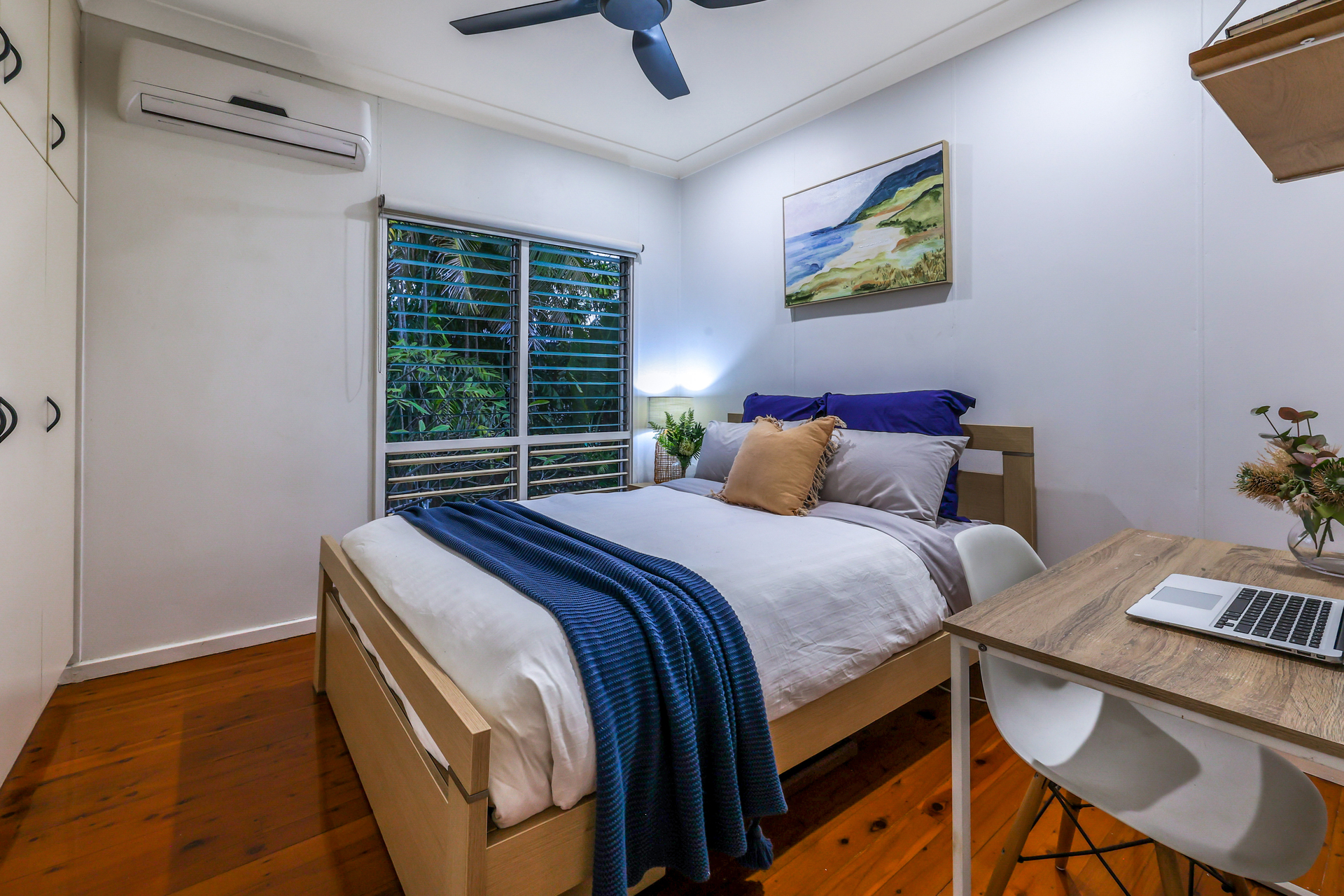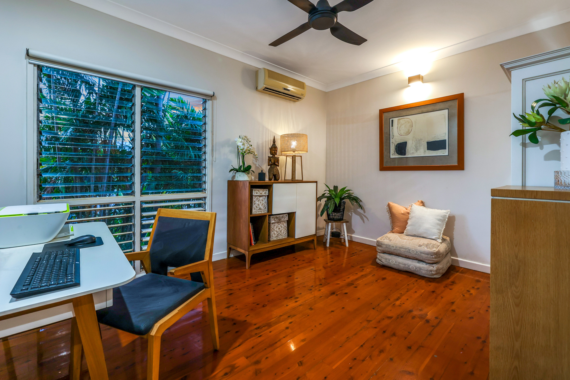 Upstairs the home has a front facing balcony basking in the glow of the setting sun and whipped with cool sea breezes. From here, double doors open into the generous living and dining areas with original hard wood flooring underfoot and endless bays of louvered windows. The kitchen has been renovated for your enjoyment with 40mm double thickness stone counters and a feature pendant light strung low over the breakfast bar seating bay.