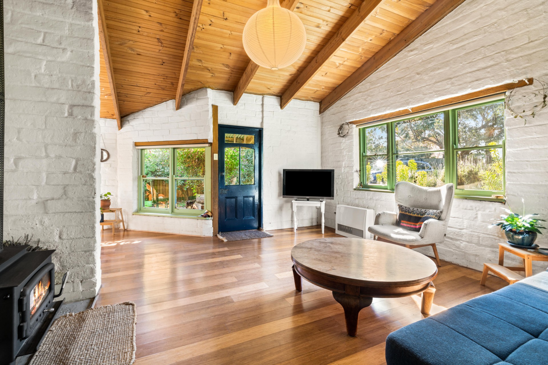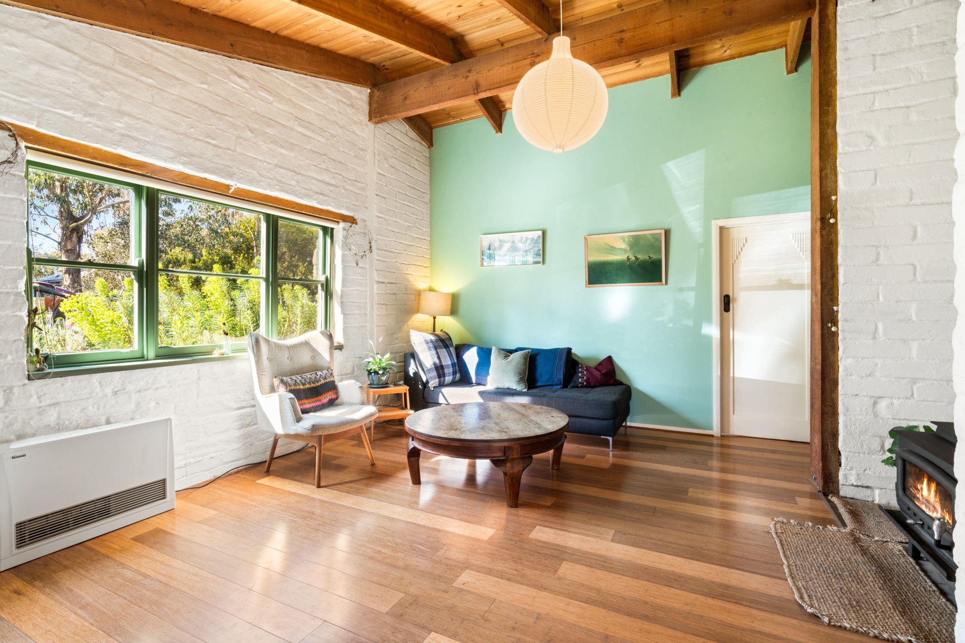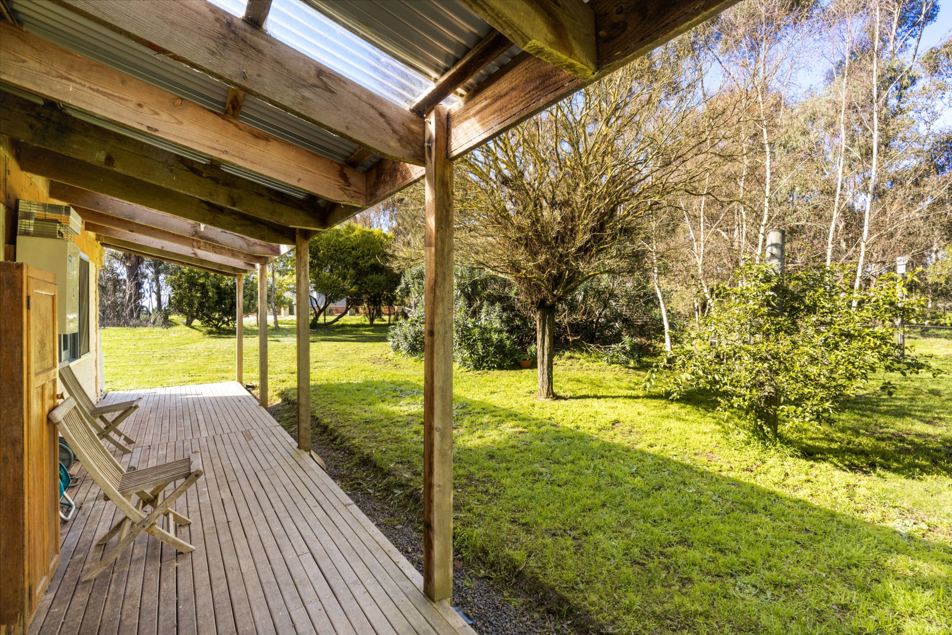 Rustic, post and beam construction, with vaulted ceilings and modern conveniences. Located at the end of Aurel Road, the property is private with outlooks over farmland, and sunset over the Otways.
