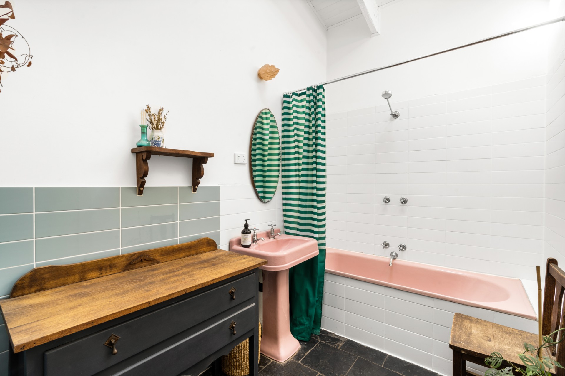 -Updated tiling in bathroom with retro fittings including cast iron bath.