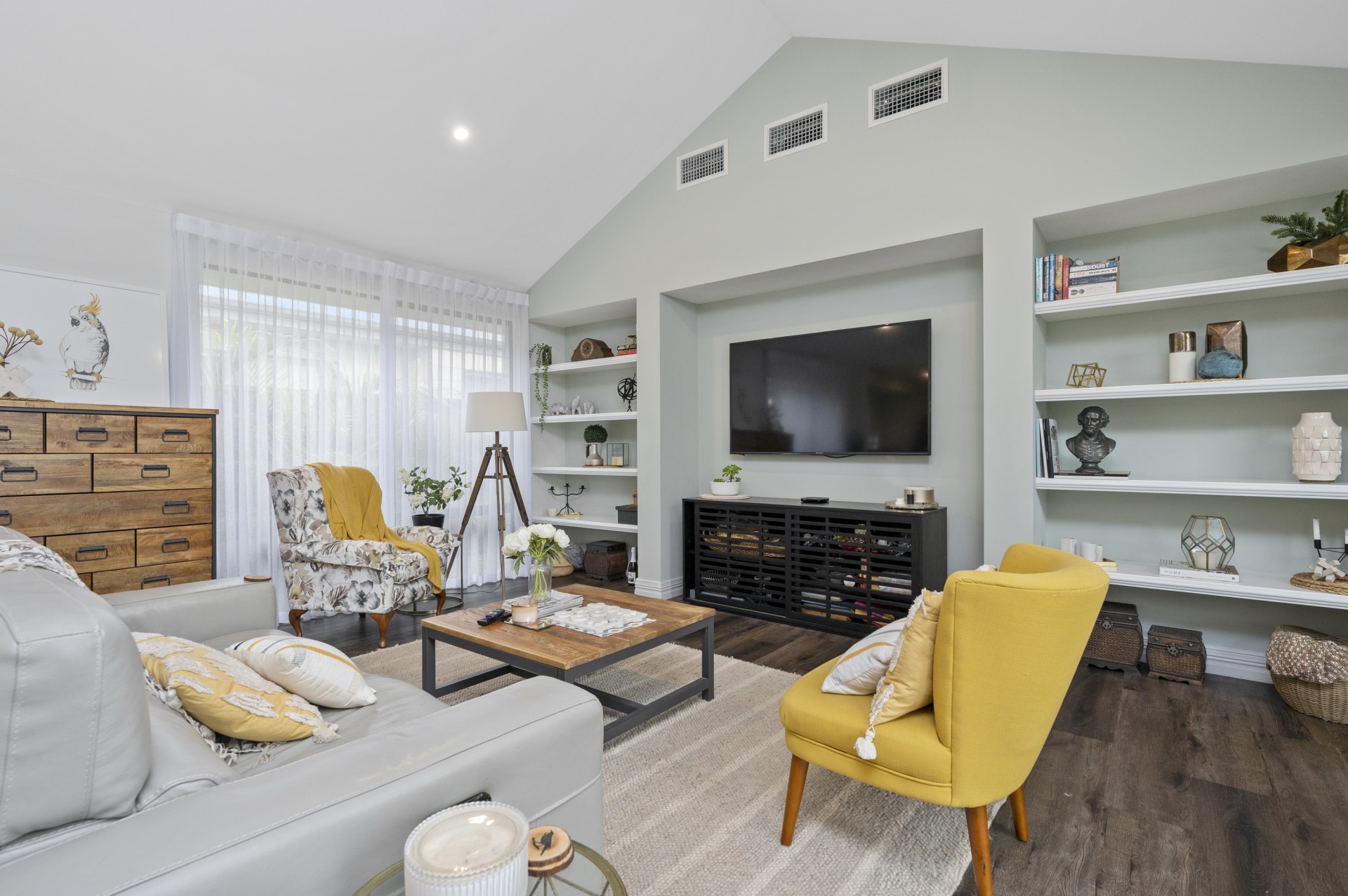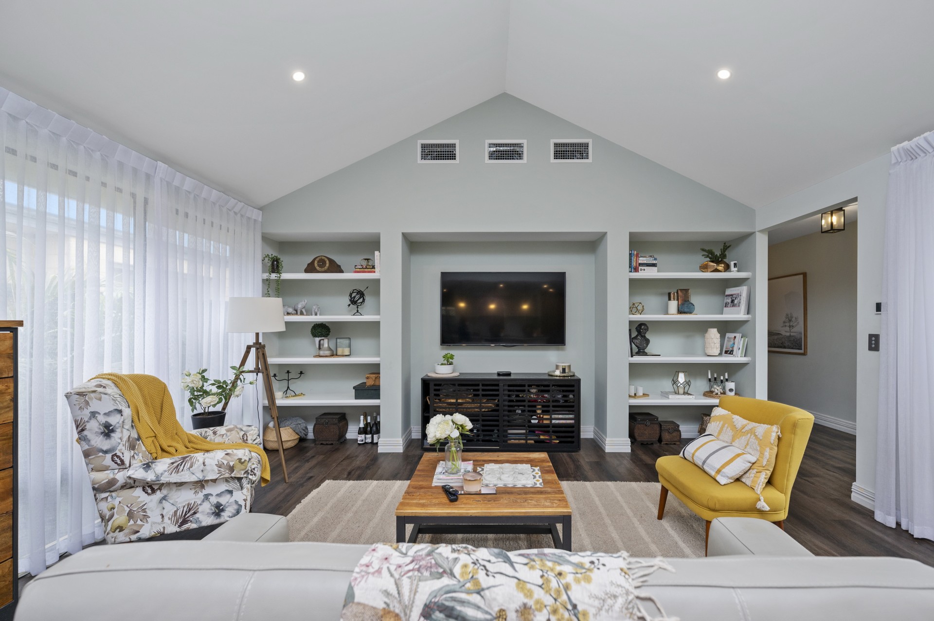 Down the hall, a large Theatre /Games room with Double sliding door access to the Alfresco is perfect for the family. Into the central Living area with its soaring cathedral ceilings and north facing windows flooding it with natural light all year round. With quality built in Timber bookcases on either side of the TV nook, a fantastic feature.