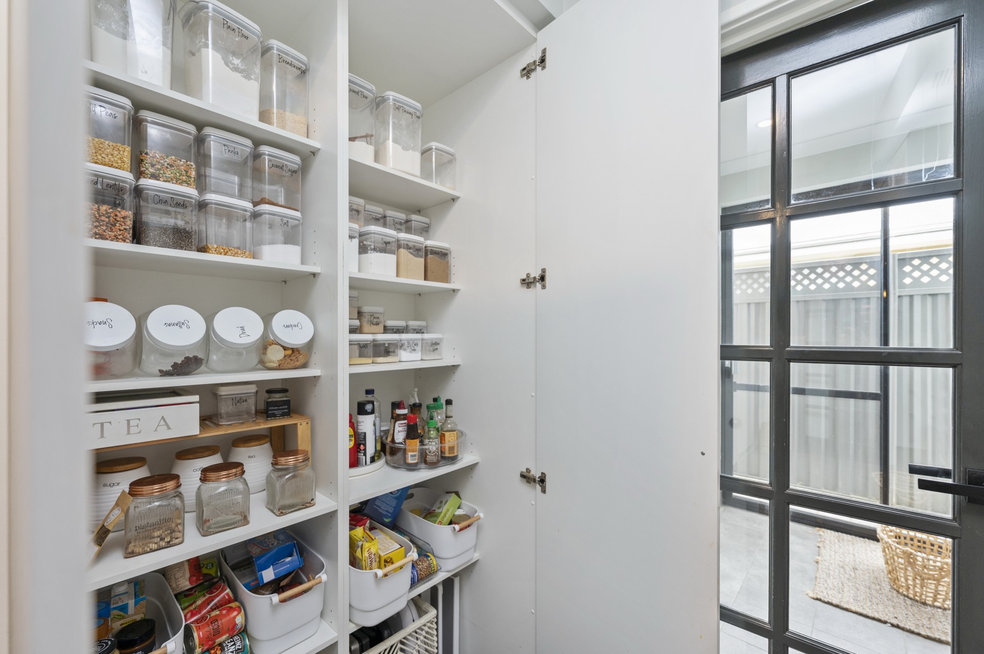 Through the French door to the Laundry were you have Full length double sliding door storage & a broom closet. The EssaStone top benches continue into the laundry.