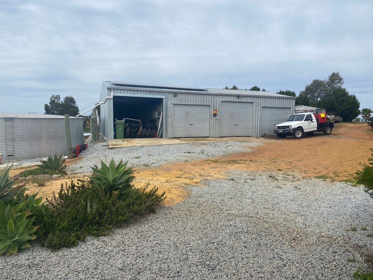 A lovely 4 x 2 with 2 bathrooms and 2 study/games /dressing room areas and a carport. There is a three bay large powered workshop with car lift and lean to, second two bay large garage with electric door for the storage of the boat and caravan all with approvals. Plenty of parking for all the toys including a carport. An all year use outdoor fly screened area with cafe blinds. Solar panels with battery storage for cheap electricity, air con in three rooms, gas log burning effect fire and ceiling fans. A 130,000 lt water tank of beautiful pure filtered rainwater.